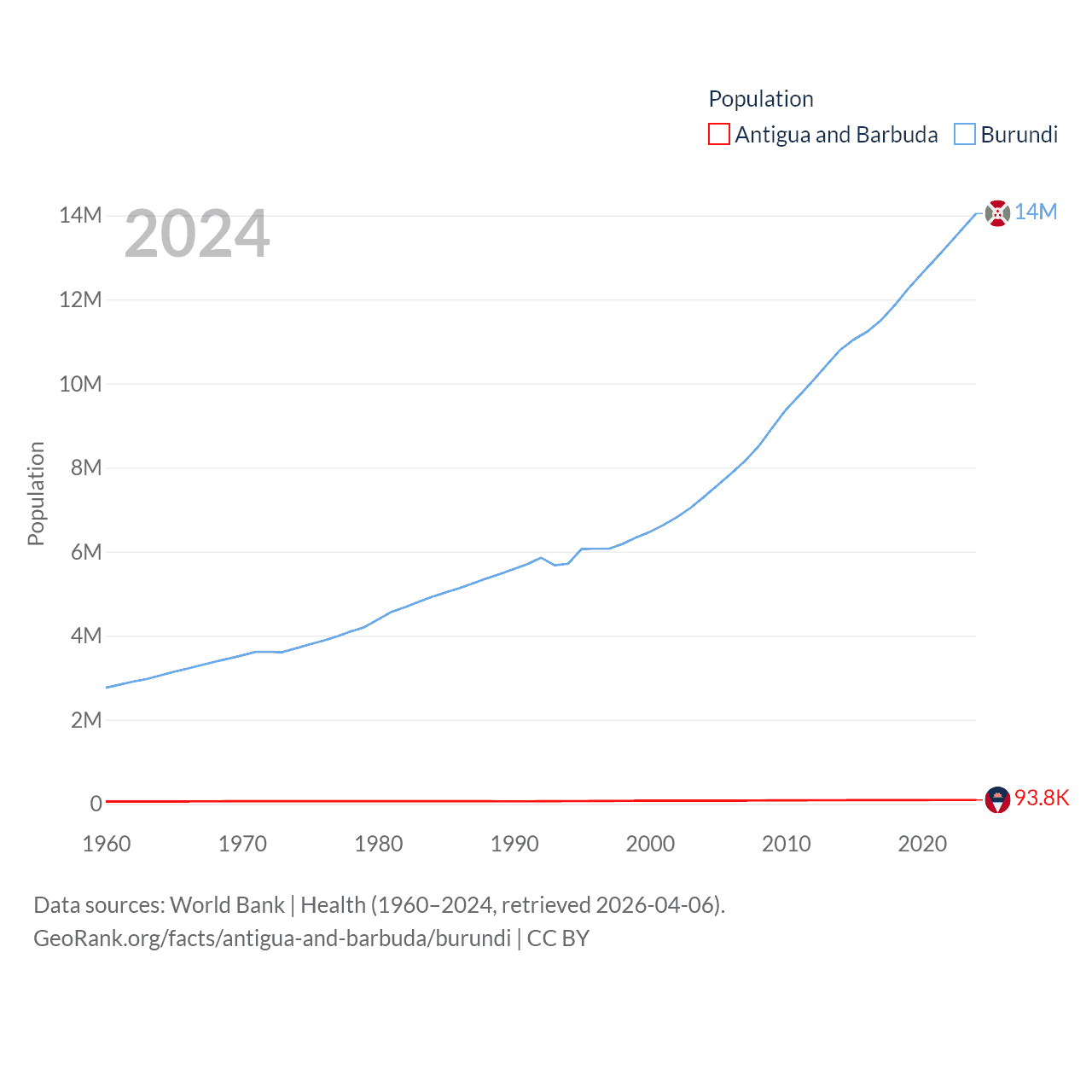Antigua and Barbuda has a population of 93.8K (ranked 185/197), compared with 14M in Burundi (ranked 78/197). Antigua and Barbuda's land area is 169.9 sq mi versus 9,915 sq mi for Burundi (ranked 183rd vs. 144th).