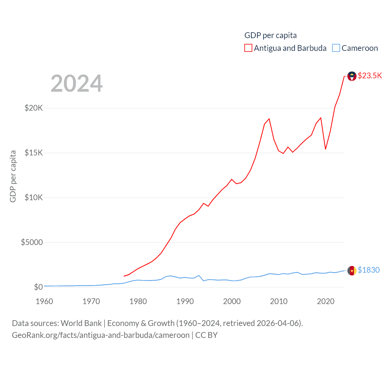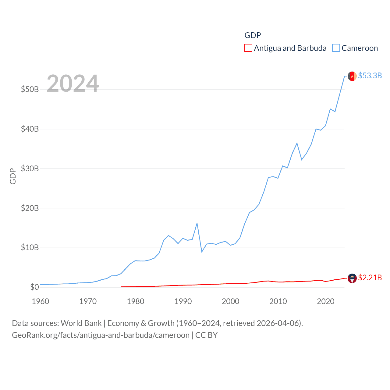 By GDP, Antigua and Barbuda ranks 177/197 ($2.21B) and Cameroon ranks 91/197 ($53.3B). By GDP per capita, Antigua and Barbuda ranks 53/197 ($23,542), while Cameroon ranks 158/197 ($1,830).