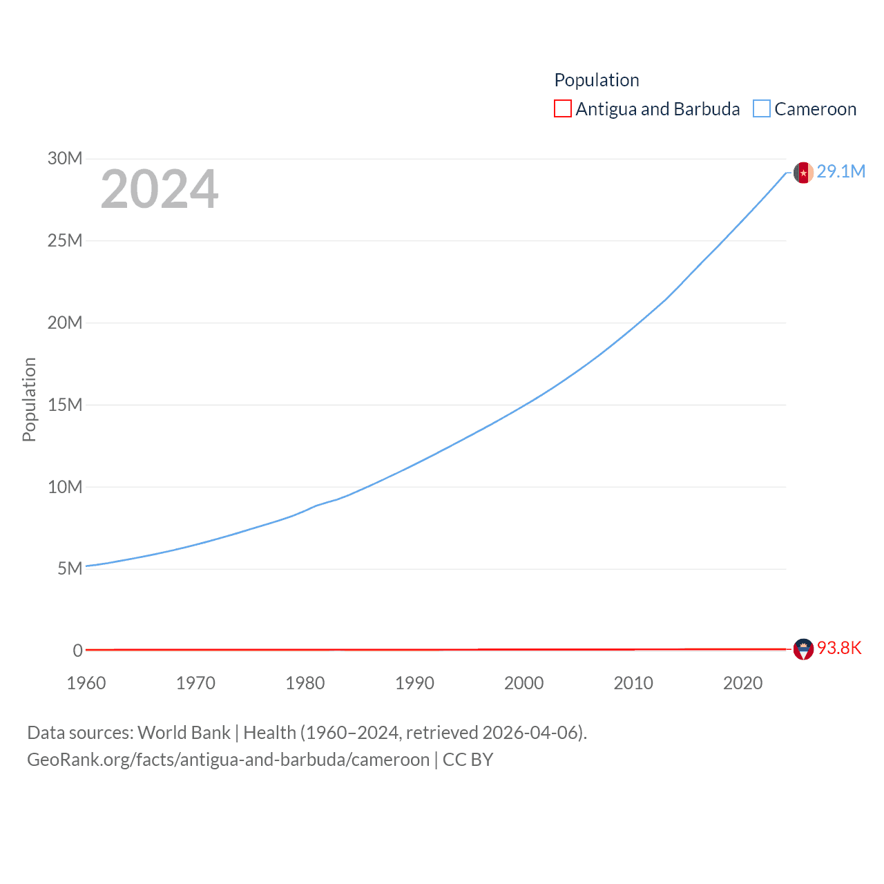 Antigua and Barbuda has a population of 93.8K (ranked 185/197), compared with 29.1M in Cameroon (ranked 52/197). Antigua and Barbuda's land area is 169.9 sq mi versus 182,514 sq mi for Cameroon (ranked 183rd vs. 52nd).
