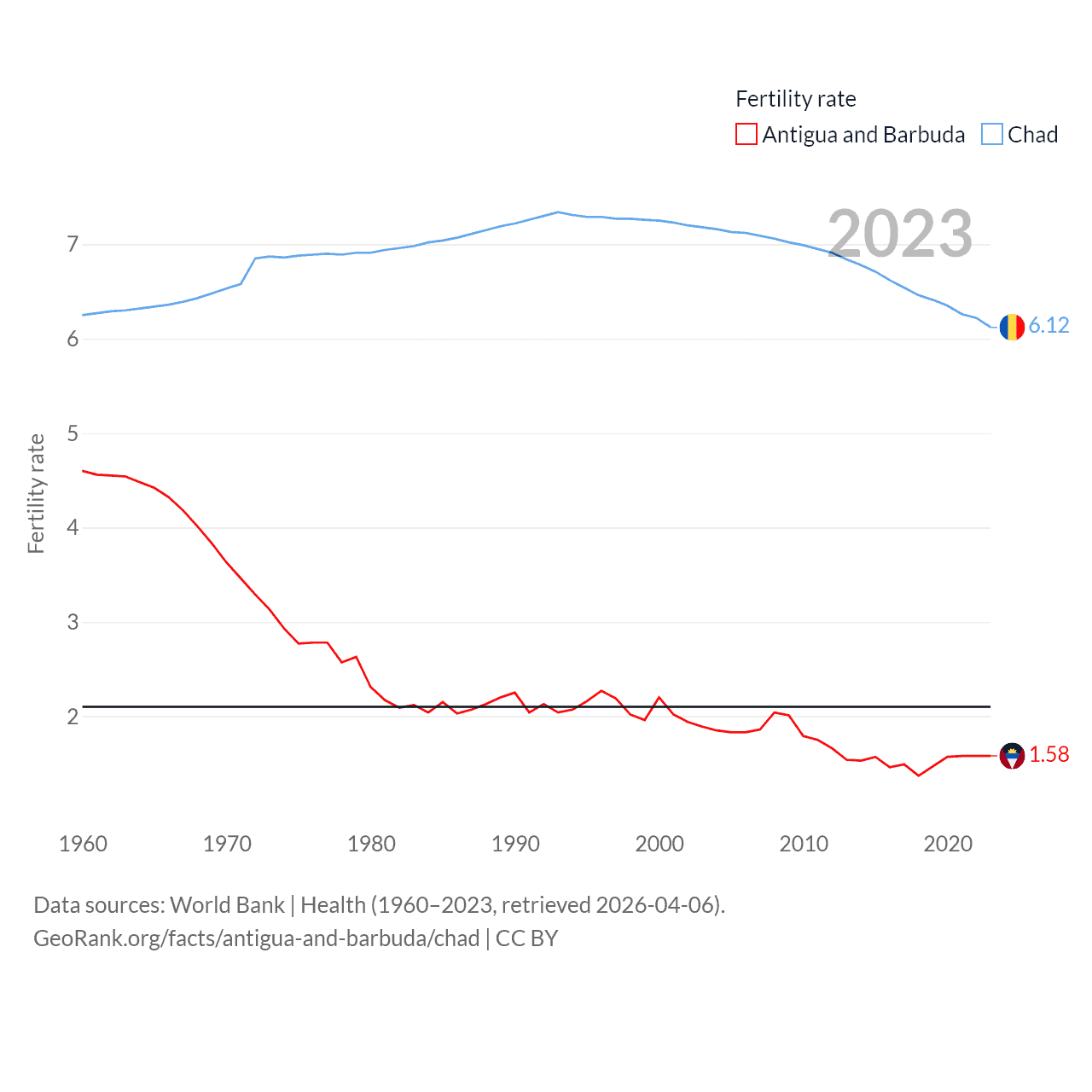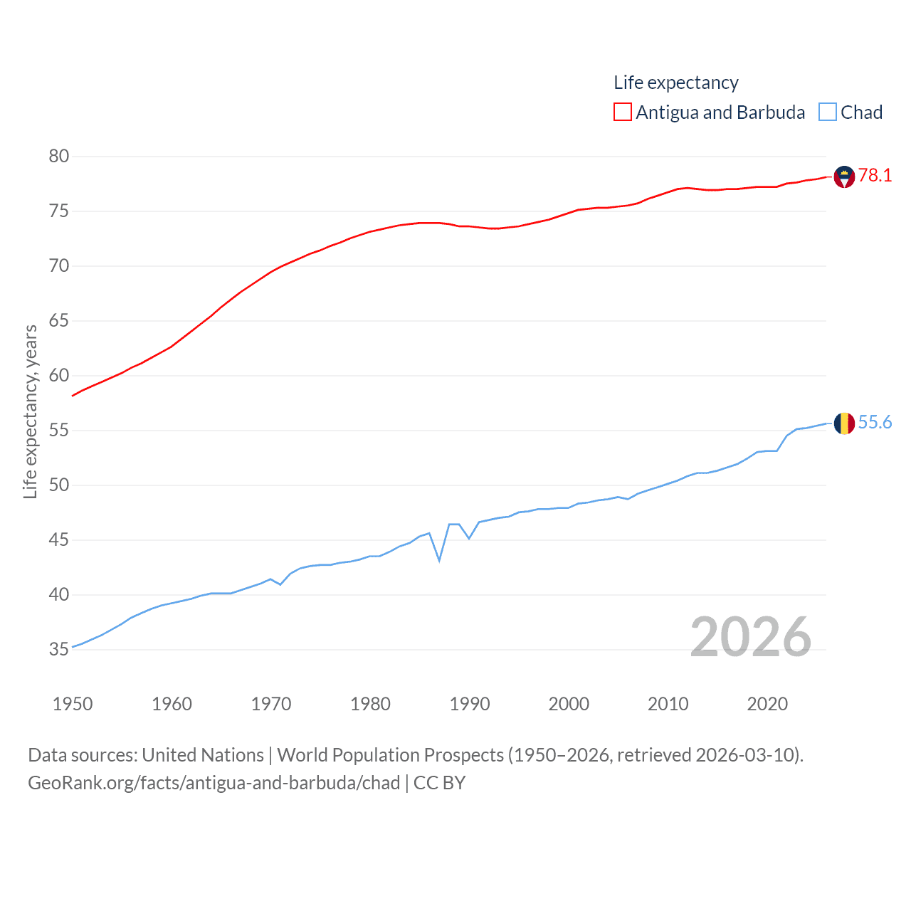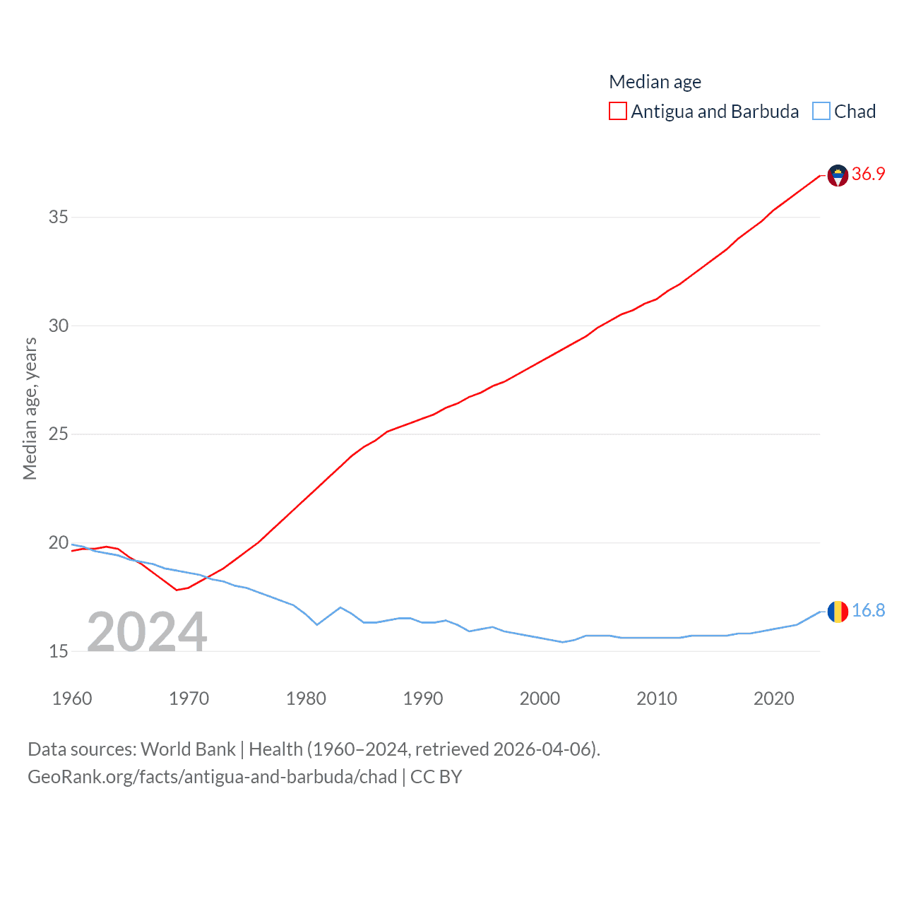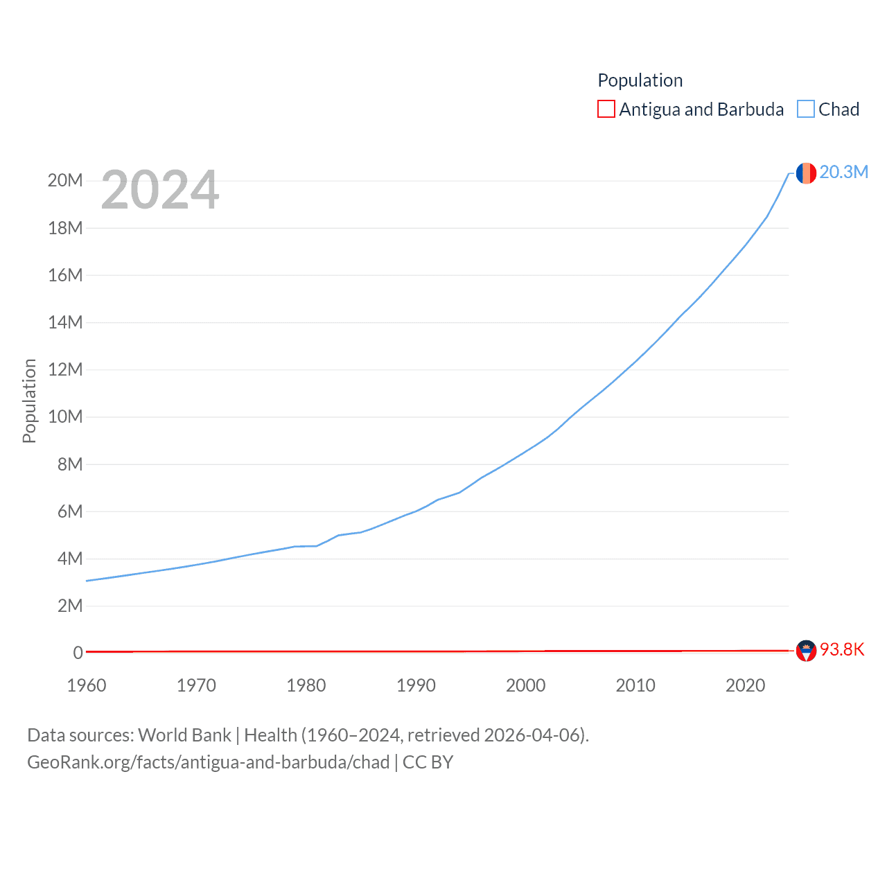 Antigua and Barbuda has a population of 93.8K (ranked 185/197), compared with 20.3M in Chad (ranked 65/197). Antigua and Barbuda's land area is 169.9 sq mi versus 486,180 sq mi for Chad (ranked 183rd vs. 21st).