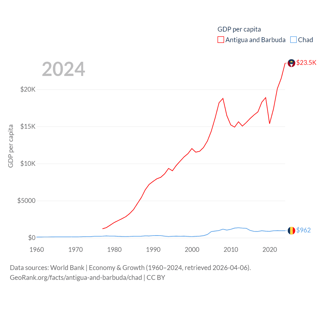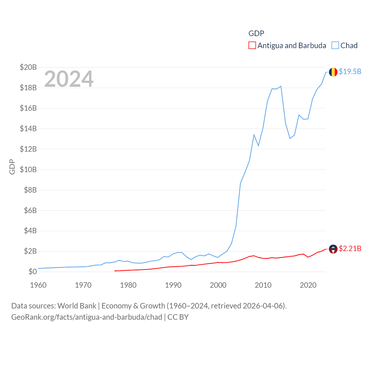 By GDP, Antigua and Barbuda ranks 177/197 ($2.21B) and Chad ranks 132/197 ($19.5B). By GDP per capita, Antigua and Barbuda ranks 53/197 ($23,542), while Chad ranks 182/197 ($962).