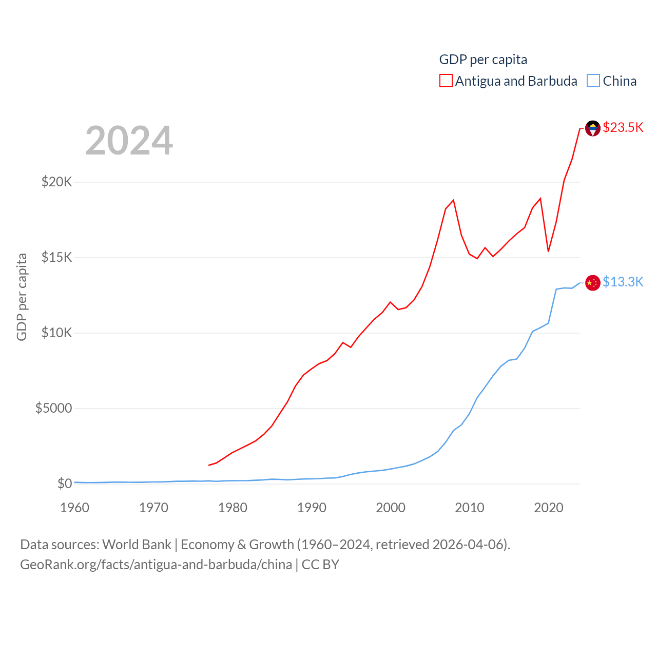 By GDP, Antigua and Barbuda ranks 177/197 ($2.21B) and China ranks 2/197 ($18.7T). By GDP per capita, Antigua and Barbuda ranks 53/197 ($23,542), while China ranks 76/197 ($13,303).