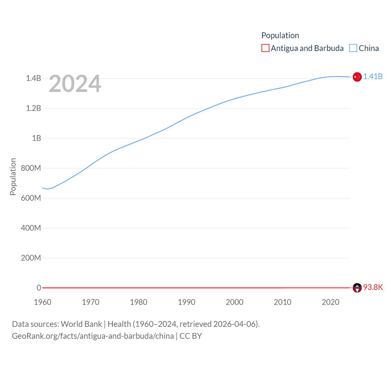 Antigua and Barbuda has a population of 93.8K (ranked 185/197), compared with 1.41B in China (ranked 2/197). Antigua and Barbuda's land area is 169.9 sq mi versus 3,624,808 sq mi for China (ranked 183rd vs. 2nd).