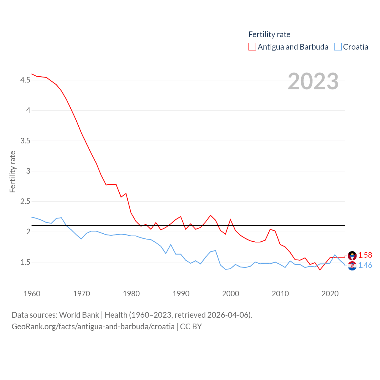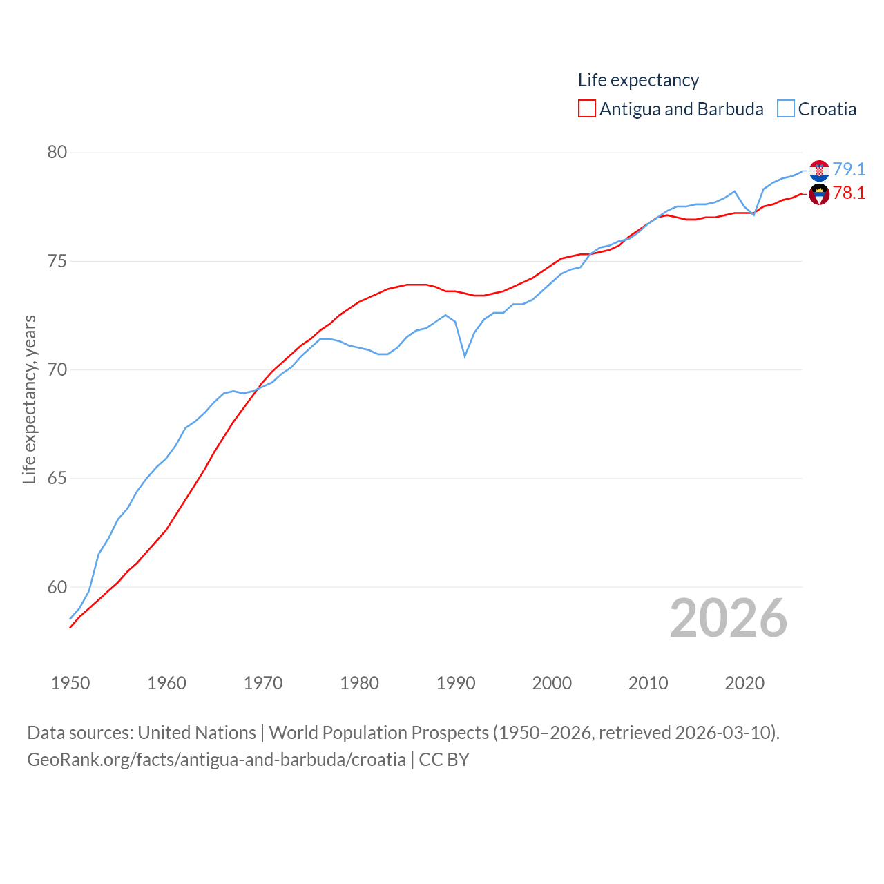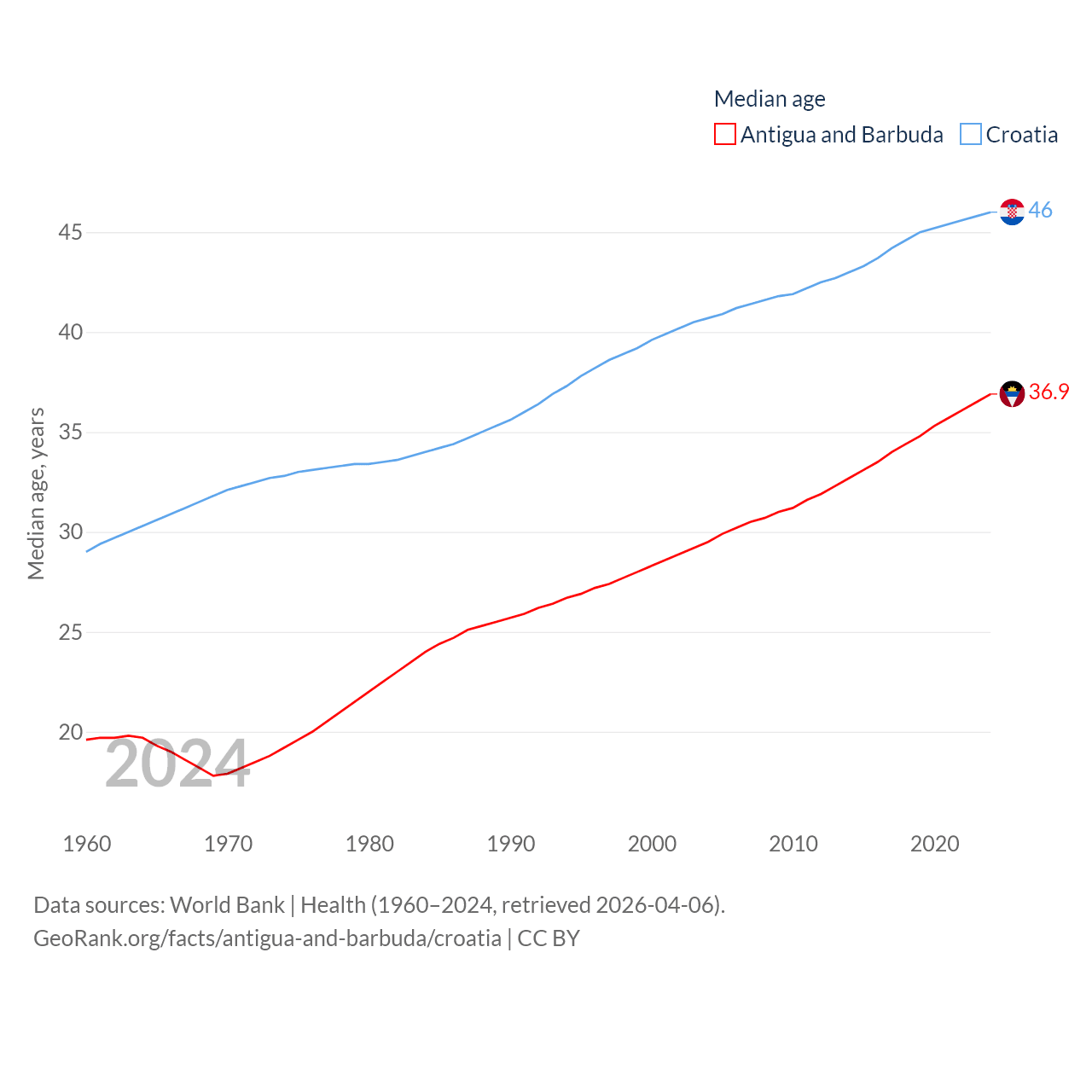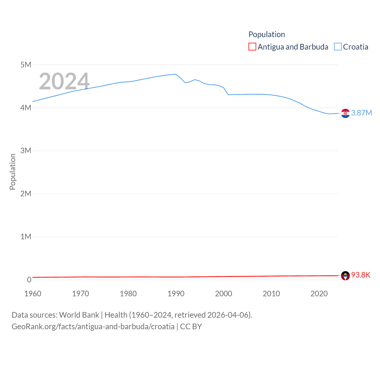 Antigua and Barbuda has a population of 93.8K (ranked 185/197), compared with 3.87M in Croatia (ranked 129/197). Antigua and Barbuda's land area is 169.9 sq mi versus 21,606 sq mi for Croatia (ranked 183rd vs. 123rd).