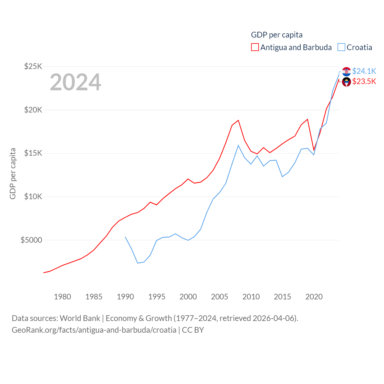 By GDP, Antigua and Barbuda ranks 177/197 ($2.21B) and Croatia ranks 75/197 ($93B). By GDP per capita, Antigua and Barbuda ranks 53/197 ($23,542), while Croatia ranks 50/197 ($24,050).