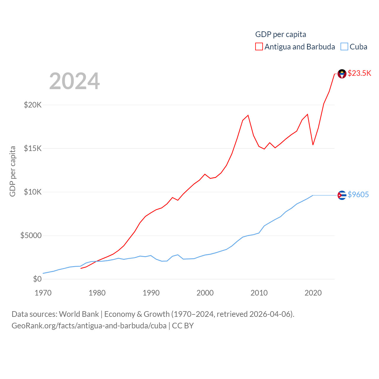 By GDP, Antigua and Barbuda ranks 177/197 ($2.21B) and Cuba ranks 69/197 ($107B). By GDP per capita, Antigua and Barbuda ranks 53/197 ($23,542), while Cuba ranks 86/197 ($9,605).