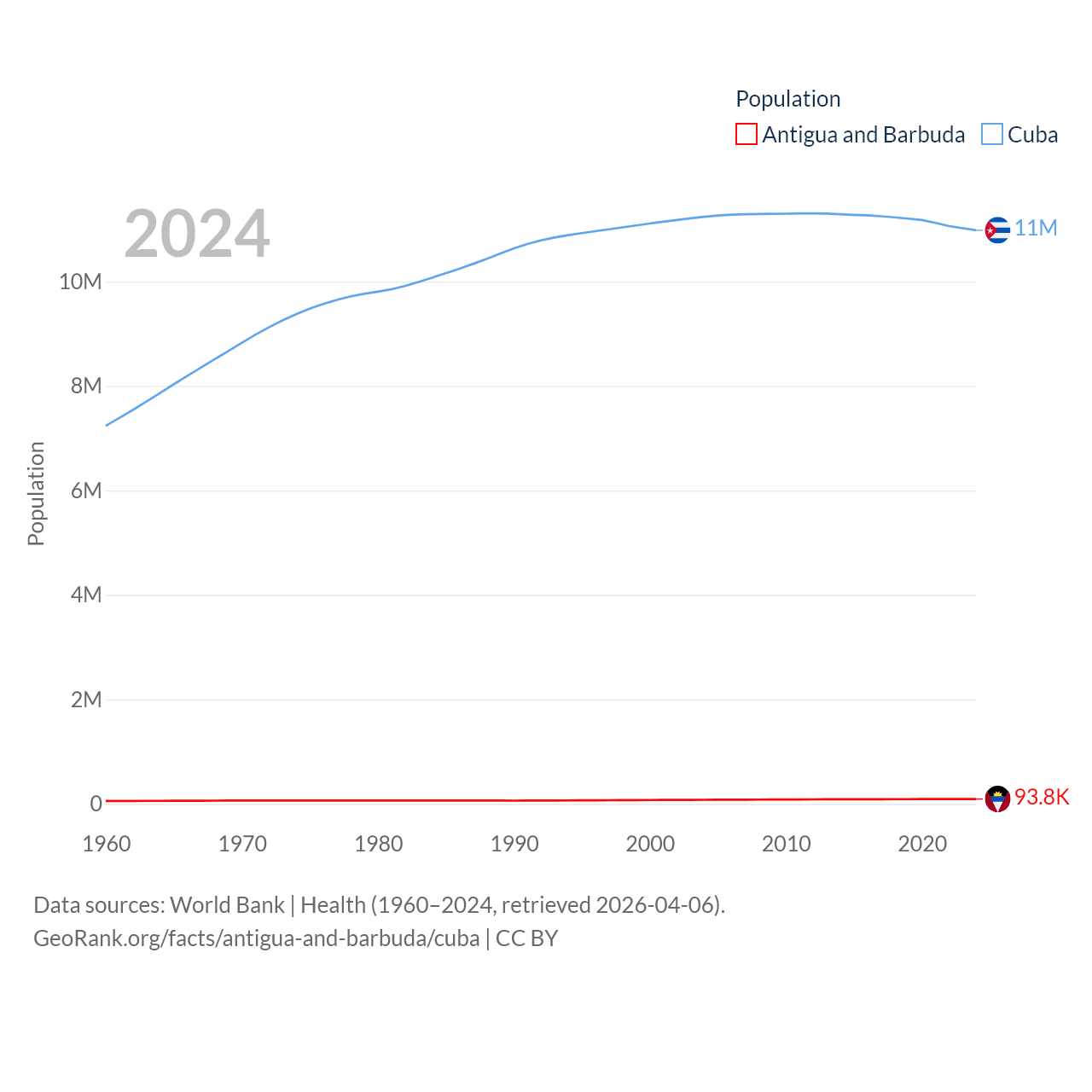 Antigua and Barbuda has a population of 93.8K (ranked 185/197), compared with 11M in Cuba (ranked 87/197). Antigua and Barbuda's land area is 169.9 sq mi versus 40,077 sq mi for Cuba (ranked 183rd vs. 103rd).