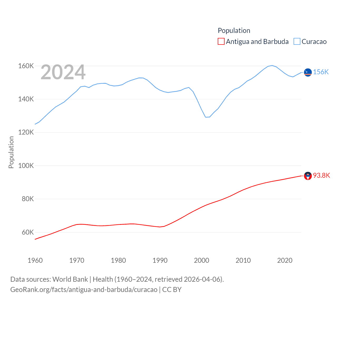 Antigua and Barbuda has a population of 93.8K (ranked 185/197), compared with 156K in Curacao (ranked 179/197). Antigua and Barbuda's land area is 169.9 sq mi versus 171.4 sq mi for Curacao (ranked 183rd vs. 182nd).
