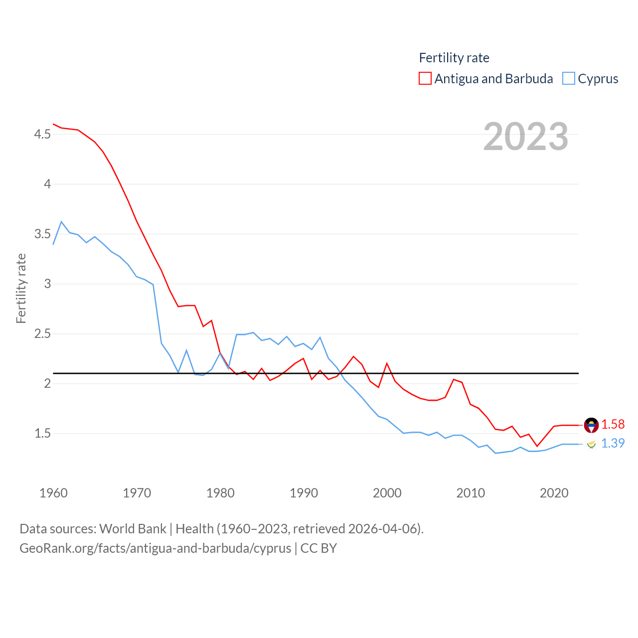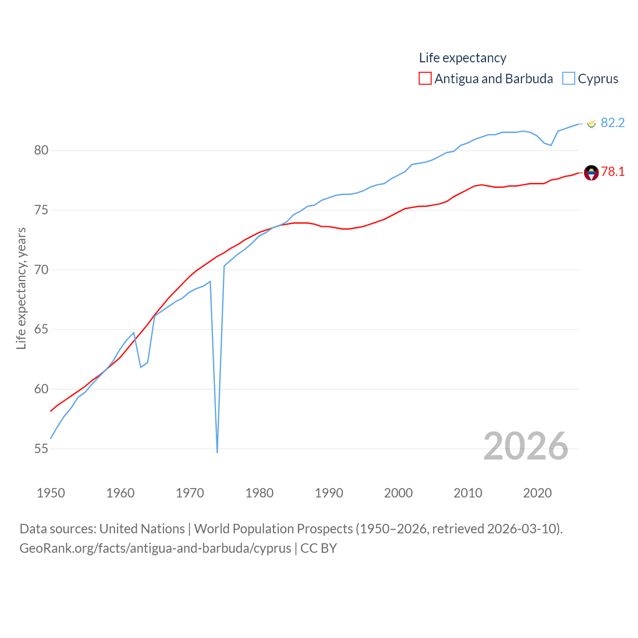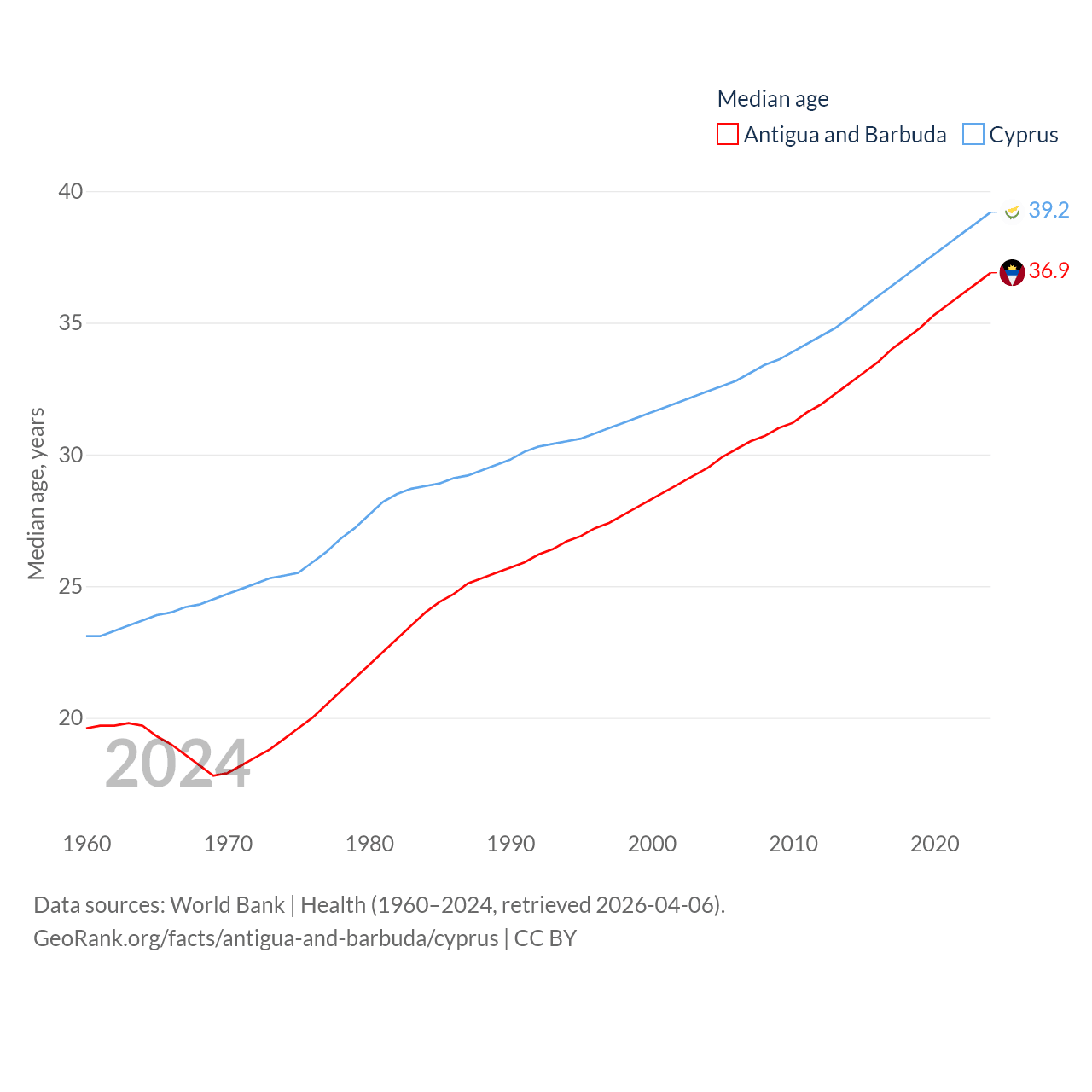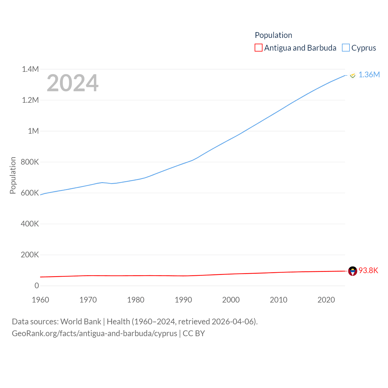 Antigua and Barbuda has a population of 93.8K (ranked 185/197), compared with 1.36M in Cyprus (ranked 155/197). Antigua and Barbuda's land area is 169.9 sq mi versus 3,568 sq mi for Cyprus (ranked 183rd vs. 163rd).