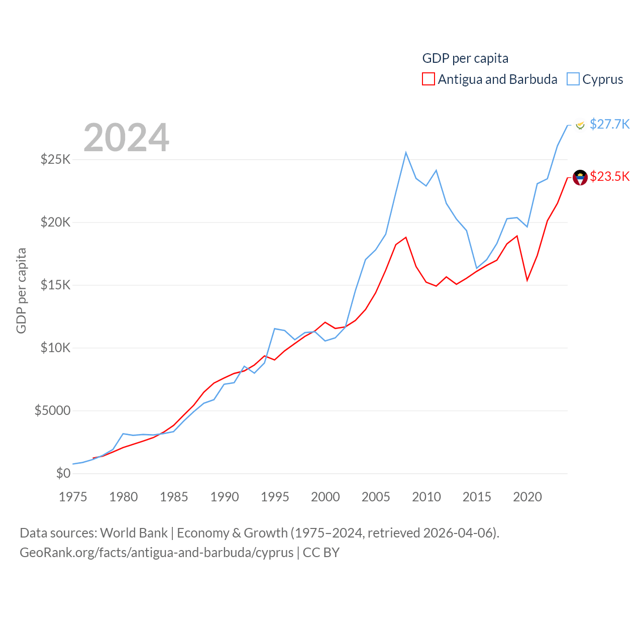 By GDP, Antigua and Barbuda ranks 177/197 ($2.21B) and Cyprus ranks 103/197 ($37.6B). By GDP per capita, Antigua and Barbuda ranks 53/197 ($23,542), while Cyprus ranks 45/197 ($27,707).
