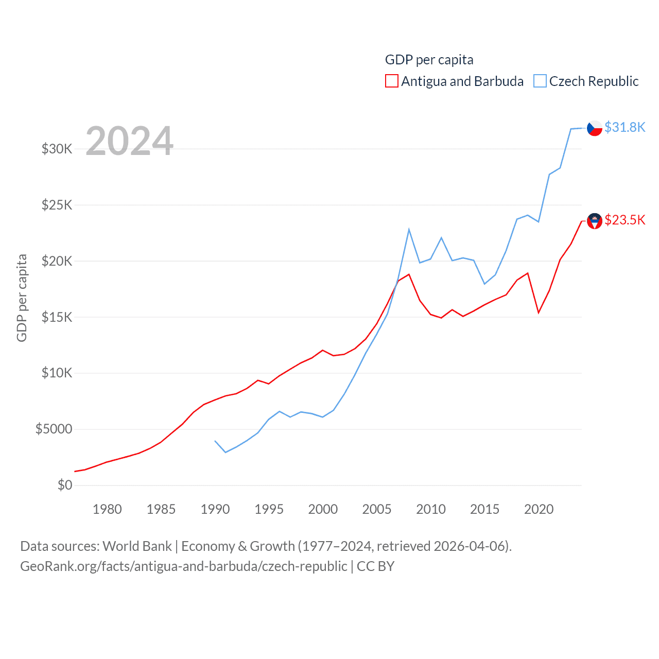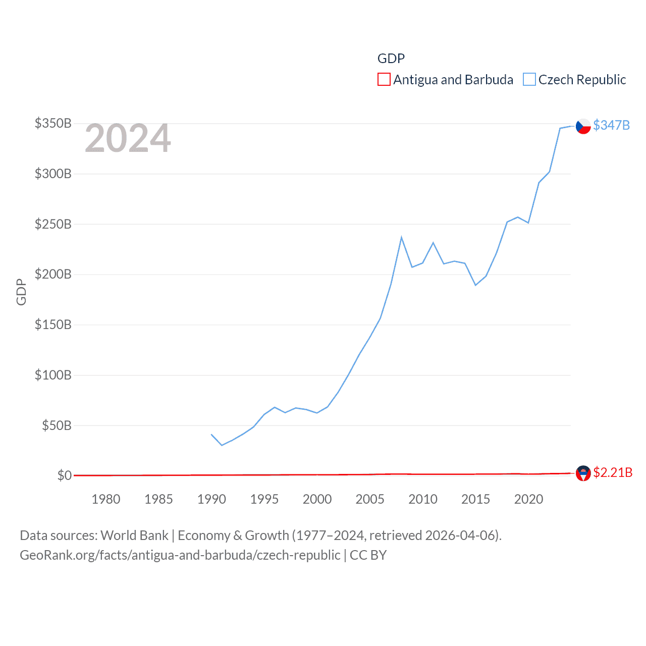 By GDP, Antigua and Barbuda ranks 177/197 ($2.21B) and The Czech Republic ranks 44/197 ($347B). By GDP per capita, Antigua and Barbuda ranks 53/197 ($23,542), while The Czech Republic ranks 39/197 ($31,823).