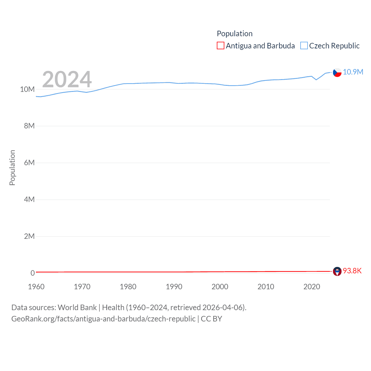 Antigua and Barbuda has a population of 93.8K (ranked 185/197), compared with 10.9M in The Czech Republic (ranked 88/197). Antigua and Barbuda's land area is 169.9 sq mi versus 29,794 sq mi for The Czech Republic (ranked 183rd vs. 114th).