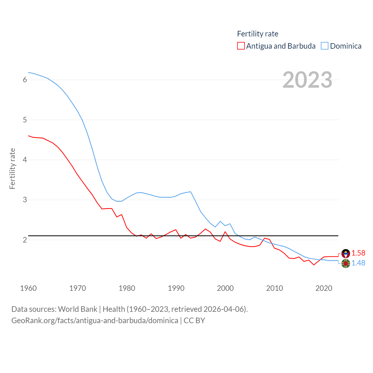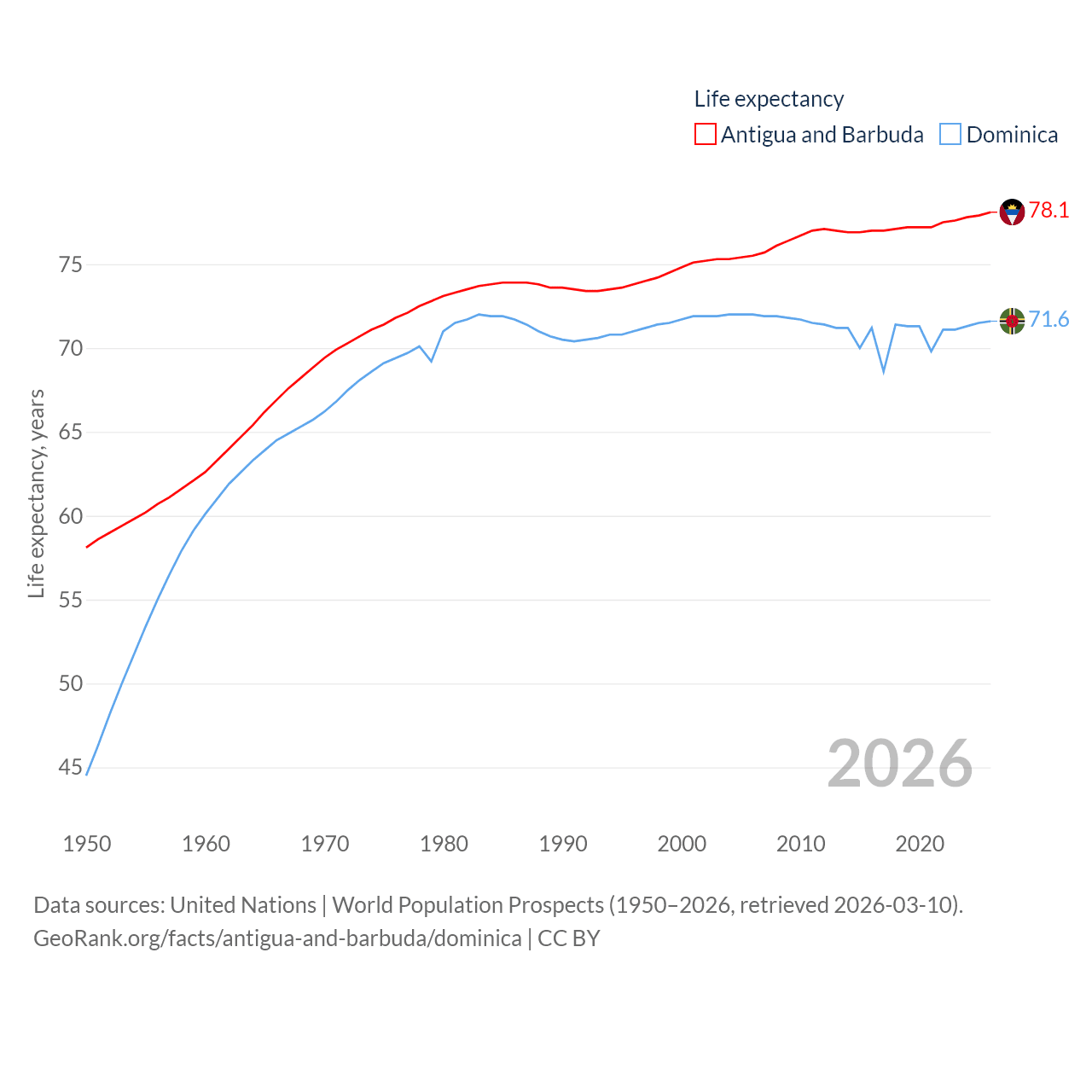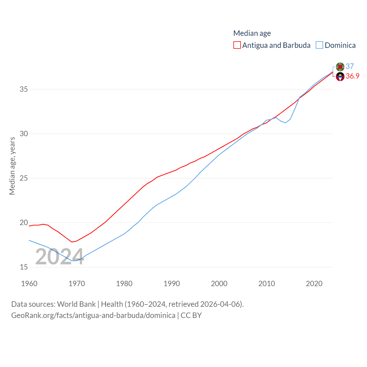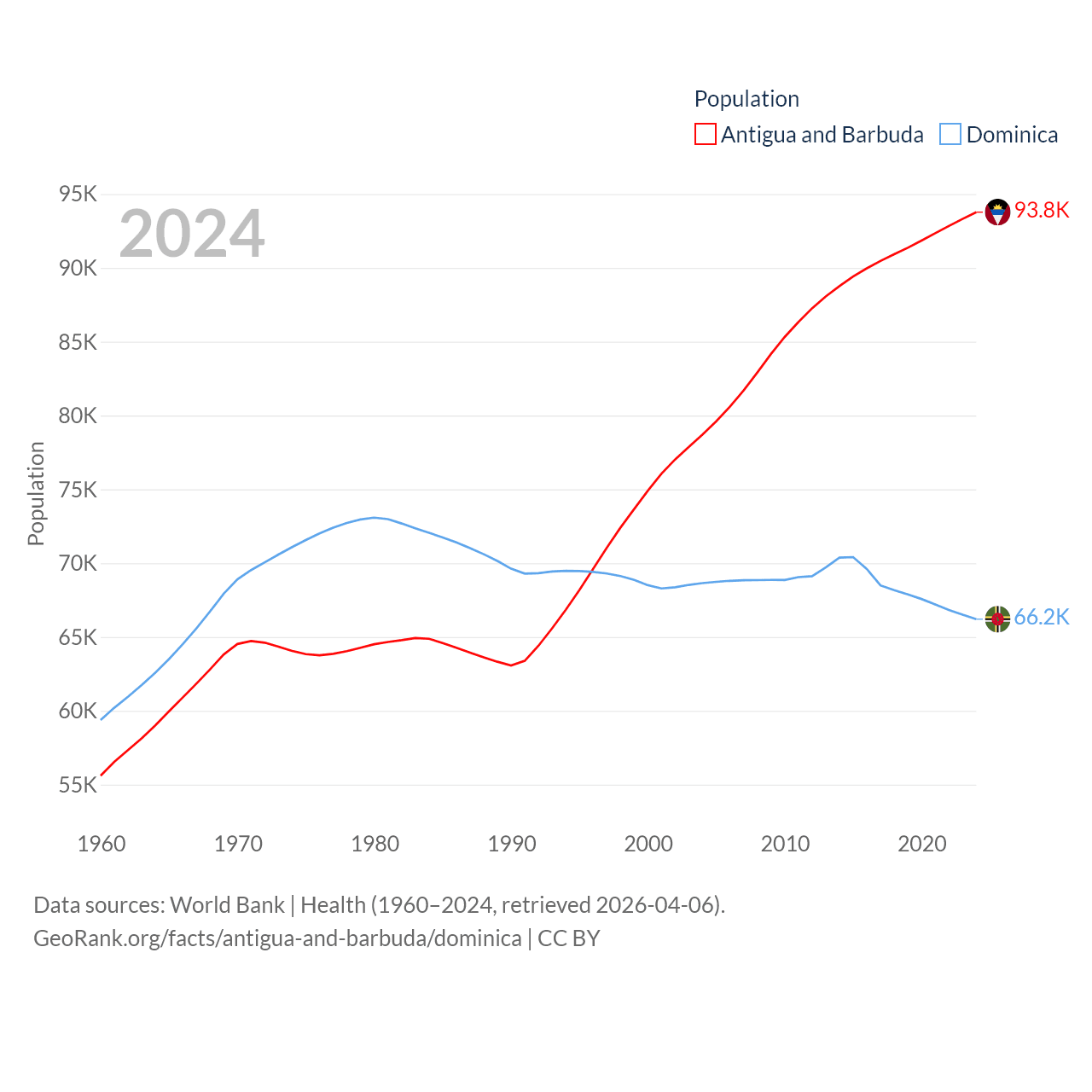 Antigua and Barbuda has a population of 93.8K (ranked 185/197), compared with 66.2K in Dominica (ranked 188/197). Antigua and Barbuda's land area is 169.9 sq mi versus 289.6 sq mi for Dominica (ranked 183rd vs. 175th).