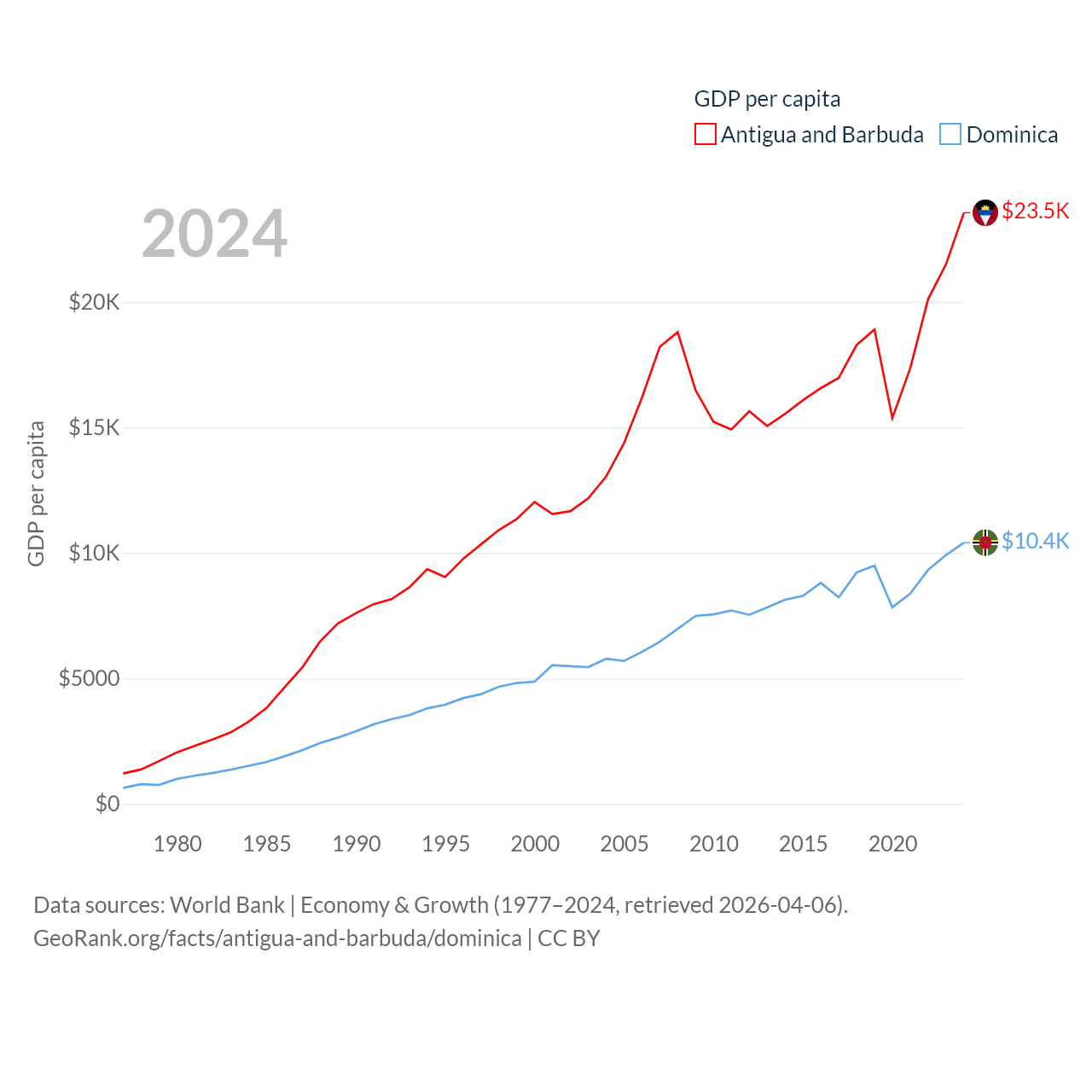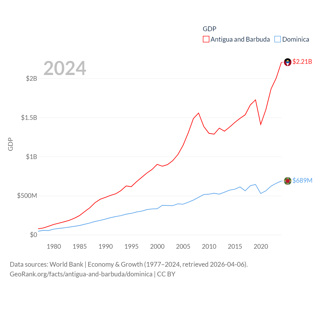 By GDP, Antigua and Barbuda ranks 177/197 ($2.21B) and Dominica ranks 190/197 ($689M). By GDP per capita, Antigua and Barbuda ranks 53/197 ($23,542), while Dominica ranks 84/197 ($10,405).