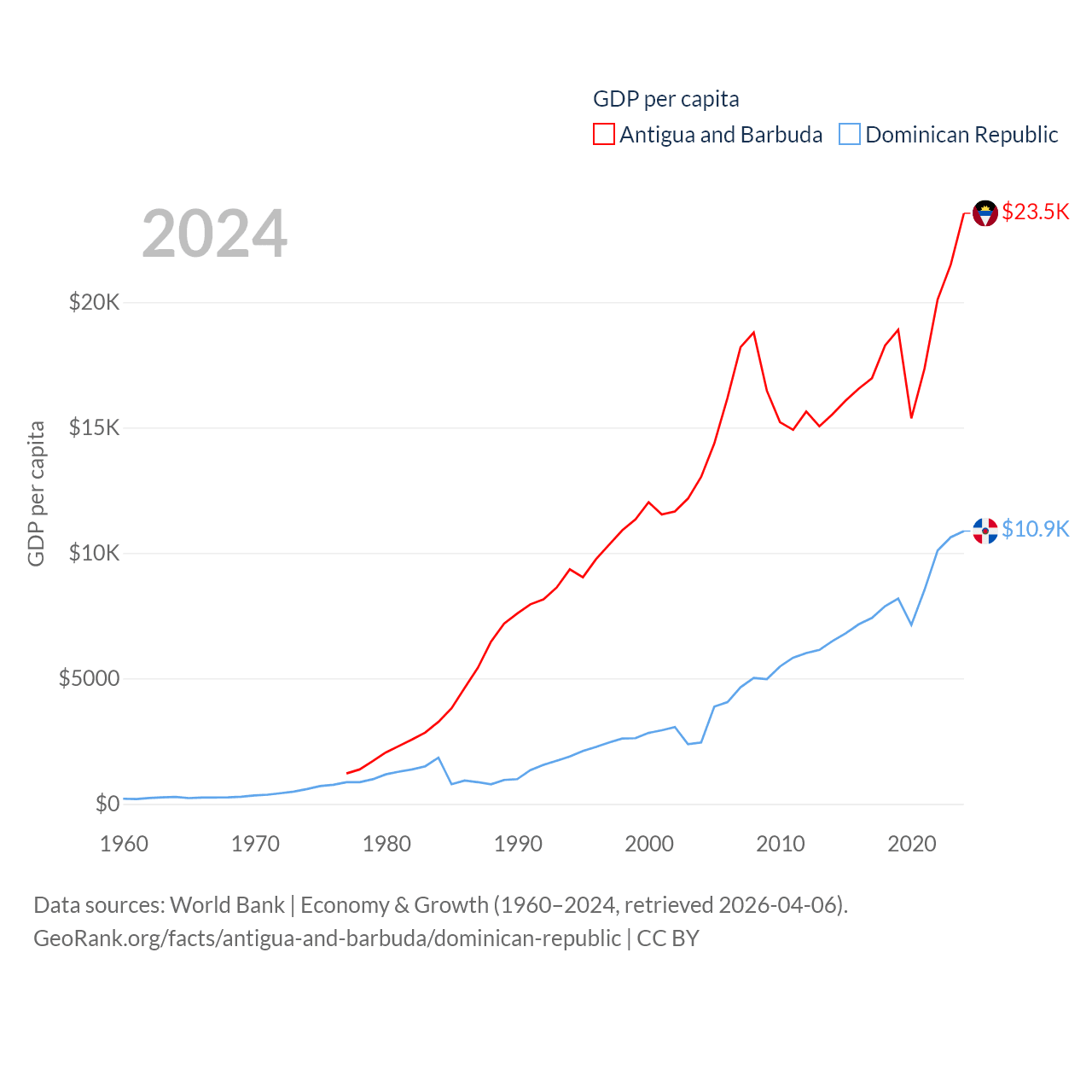 By GDP, Antigua and Barbuda ranks 177/197 ($2.21B) and The Dominican Republic ranks 63/197 ($124B). By GDP per capita, Antigua and Barbuda ranks 53/197 ($23,542), while The Dominican Republic ranks 83/197 ($10,876).