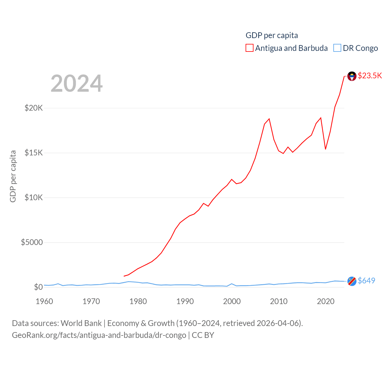 By GDP, Antigua and Barbuda ranks 177/197 ($2.21B) and The DR Congo ranks 87/197 ($71B). By GDP per capita, Antigua and Barbuda ranks 53/197 ($23,542), while The DR Congo ranks 190/197 ($649).