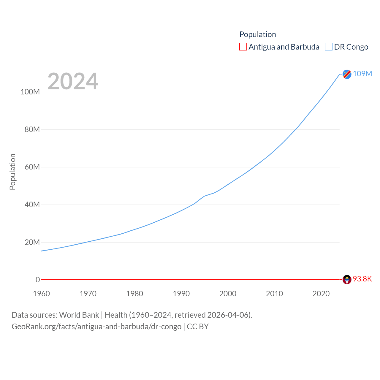 Antigua and Barbuda has a population of 93.8K (ranked 185/197), compared with 109M in The DR Congo (ranked 15/197). Antigua and Barbuda's land area is 169.9 sq mi versus 875,313 sq mi for The DR Congo (ranked 183rd vs. 11th).