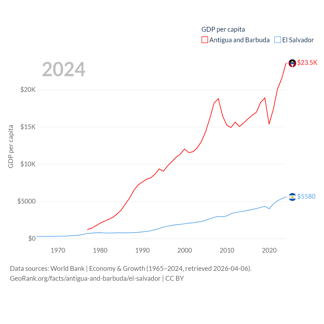 By GDP, Antigua and Barbuda ranks 177/197 ($2.21B) and El Salvador ranks 105/197 ($35.4B). By GDP per capita, Antigua and Barbuda ranks 53/197 ($23,542), while El Salvador ranks 116/197 ($5,580).
