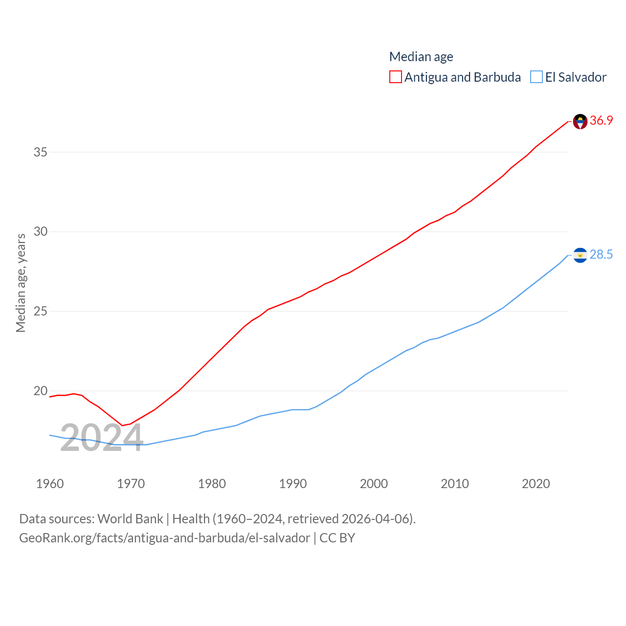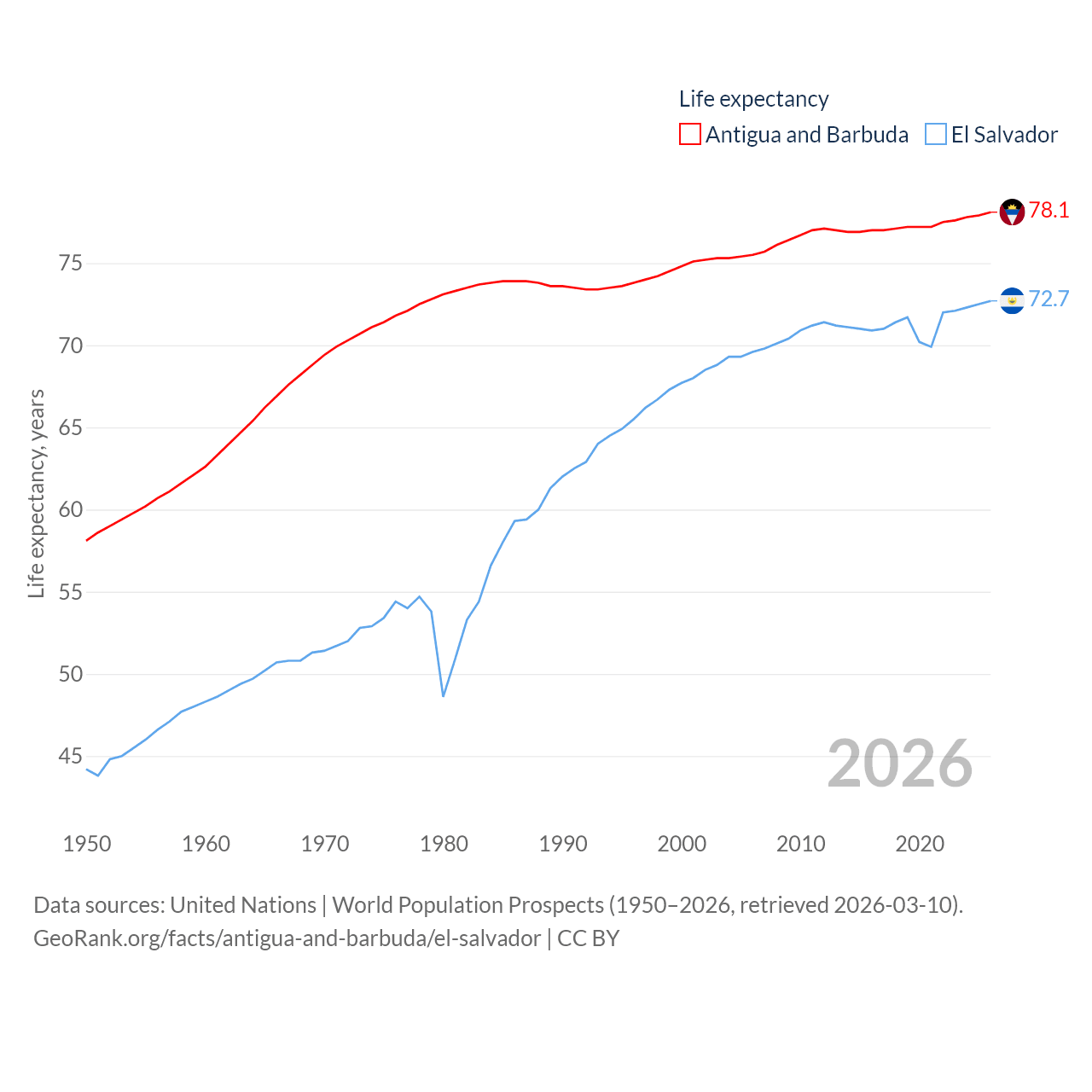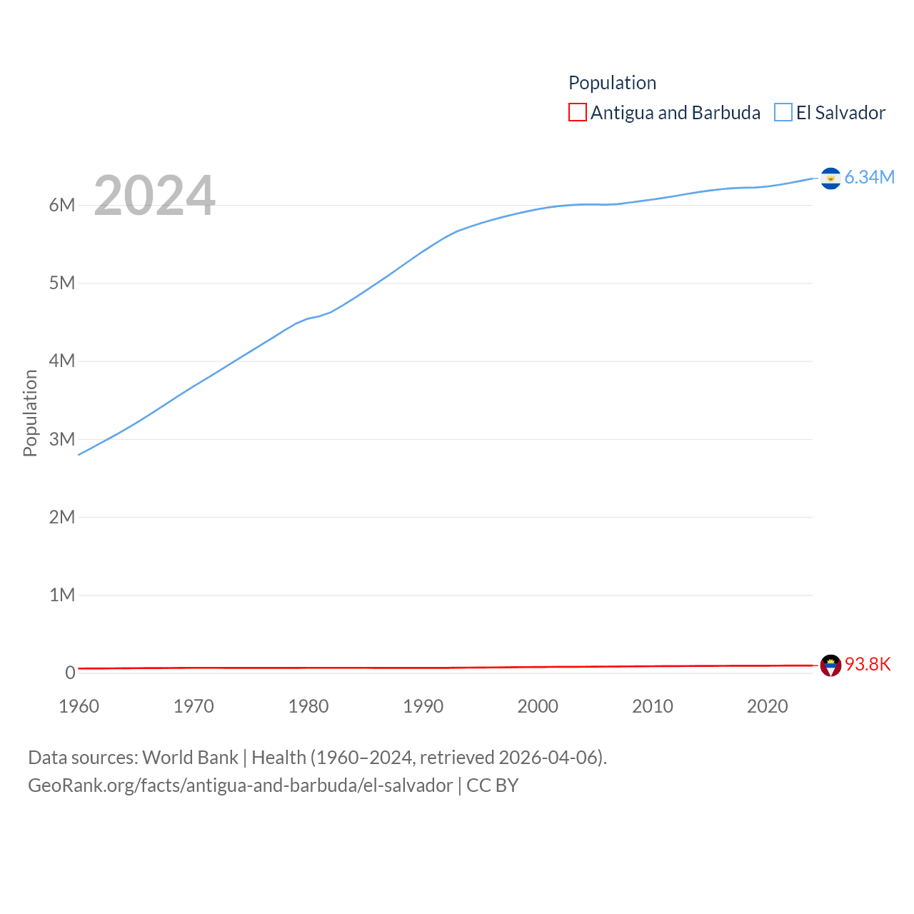 Antigua and Barbuda has a population of 93.8K (ranked 185/197), compared with 6.34M in El Salvador (ranked 111/197). Antigua and Barbuda's land area is 169.9 sq mi versus 8,000 sq mi for El Salvador (ranked 183rd vs. 150th).