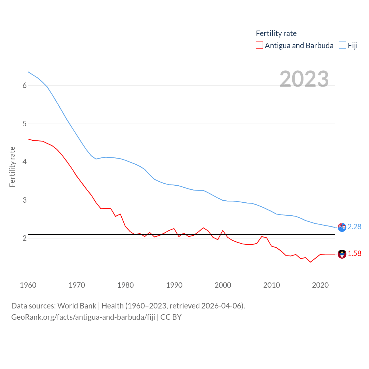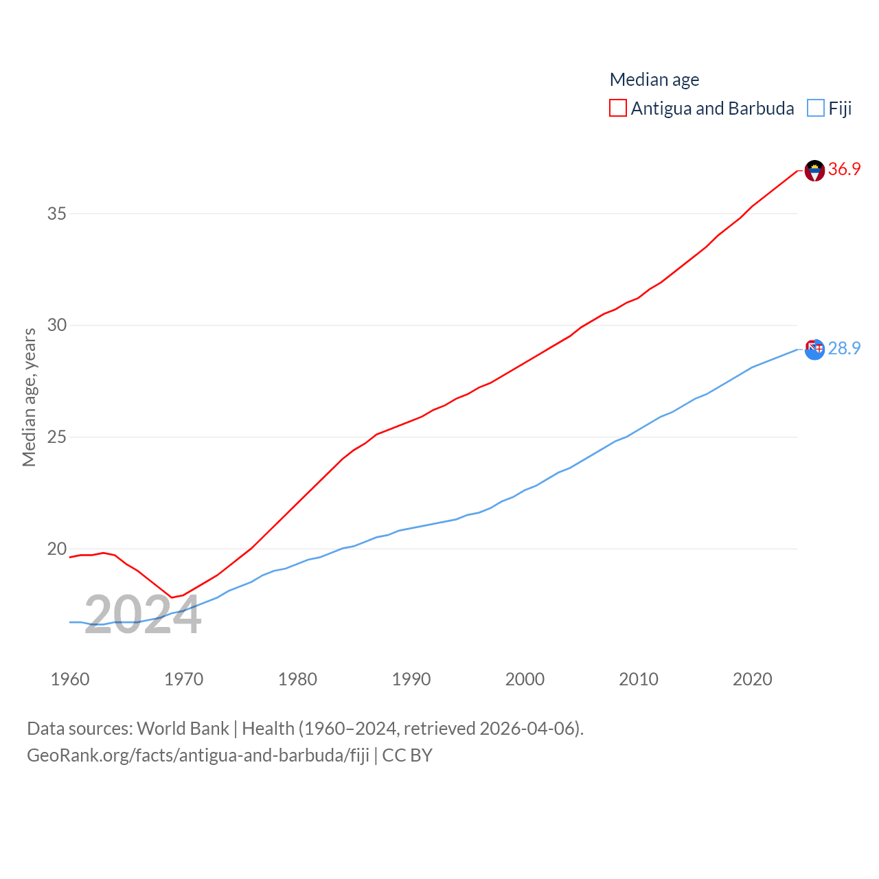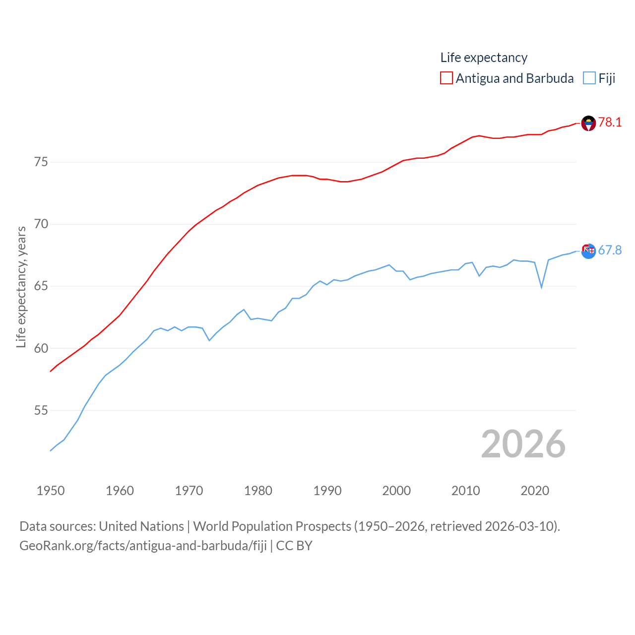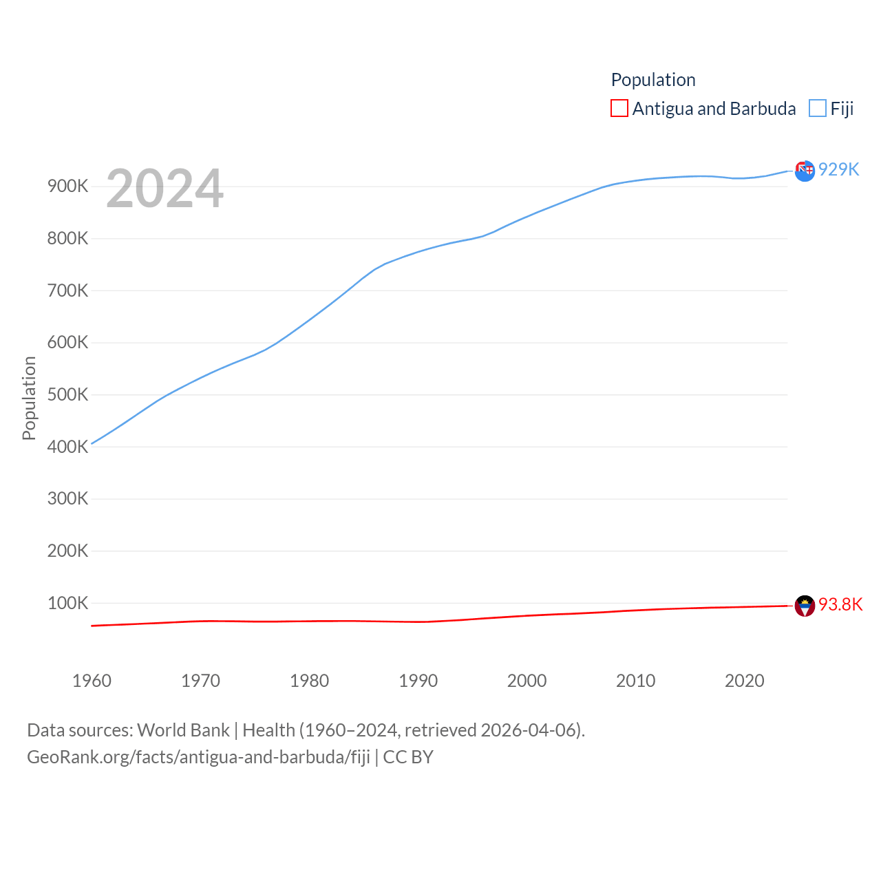 Antigua and Barbuda has a population of 93.8K (ranked 185/197), compared with 929K in Fiji (ranked 159/197). Antigua and Barbuda's land area is 169.9 sq mi versus 7,054 sq mi for Fiji (ranked 183rd vs. 152nd).