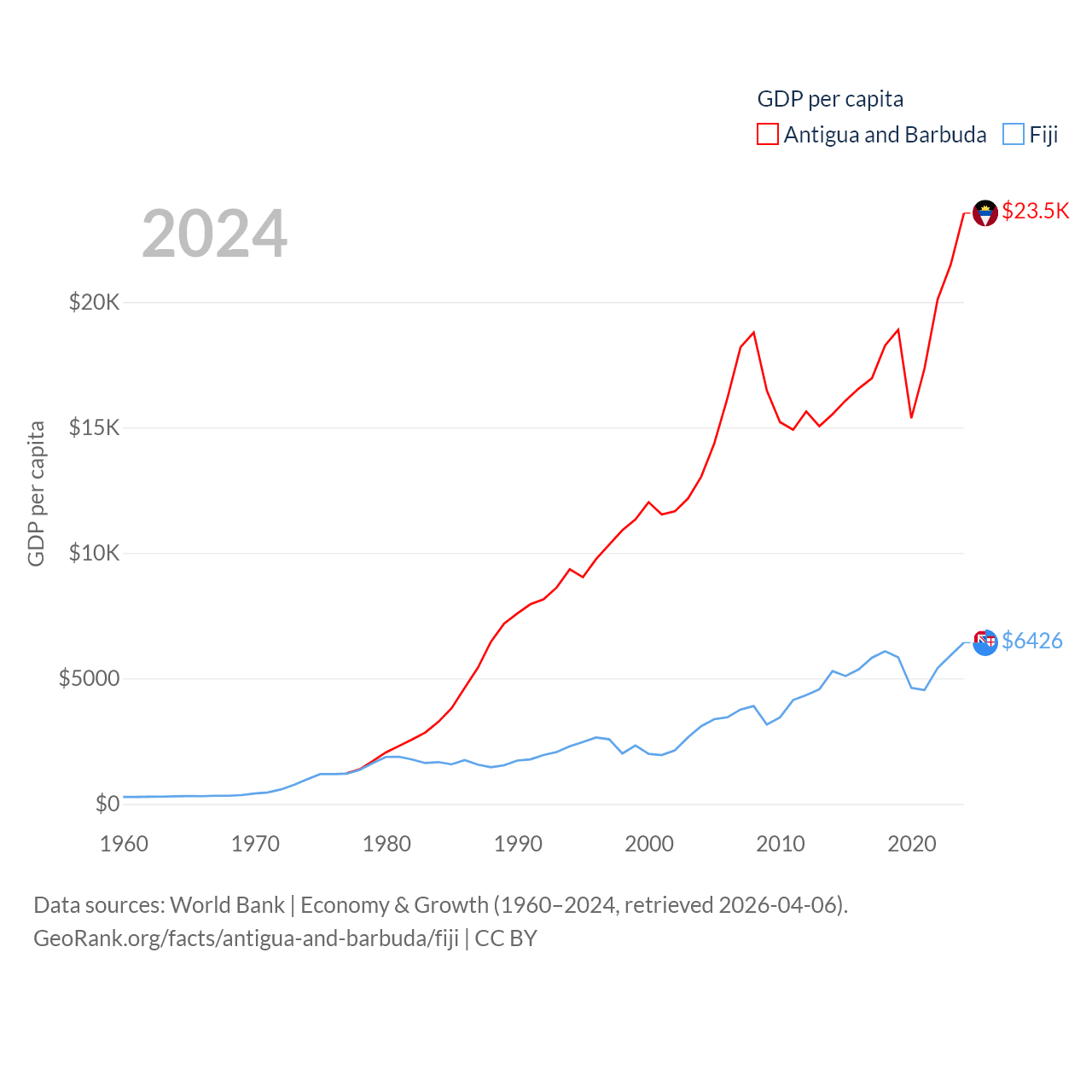By GDP, Antigua and Barbuda ranks 177/197 ($2.21B) and Fiji ranks 161/197 ($5.97B). By GDP per capita, Antigua and Barbuda ranks 53/197 ($23,542), while Fiji ranks 108/197 ($6,426).