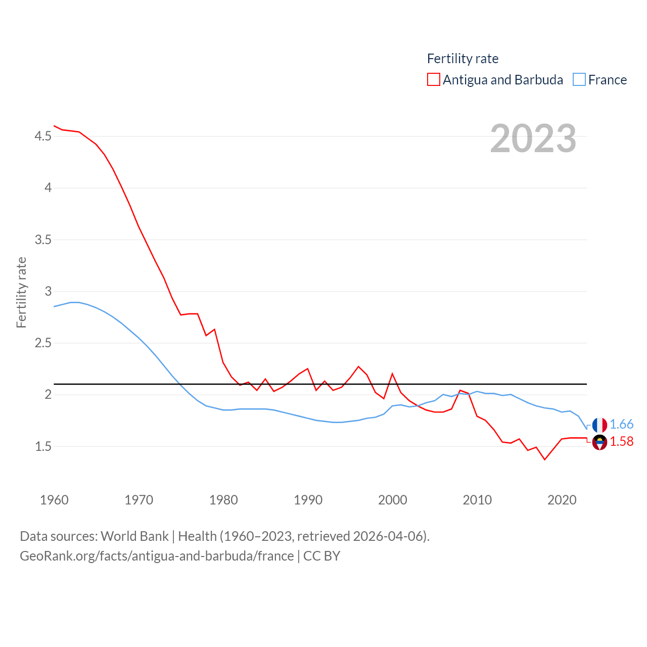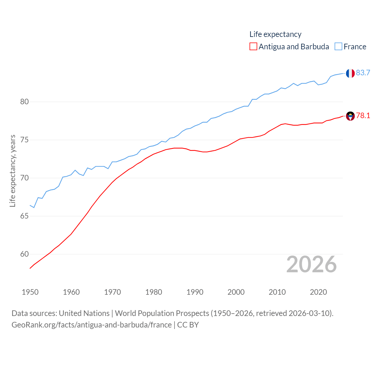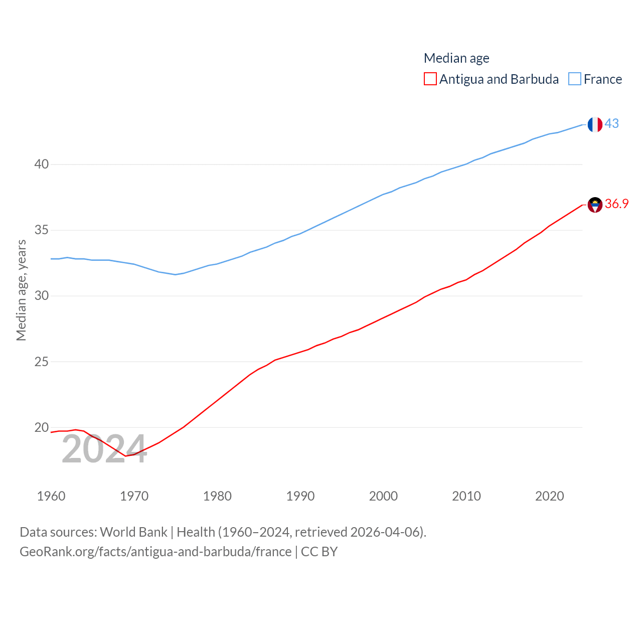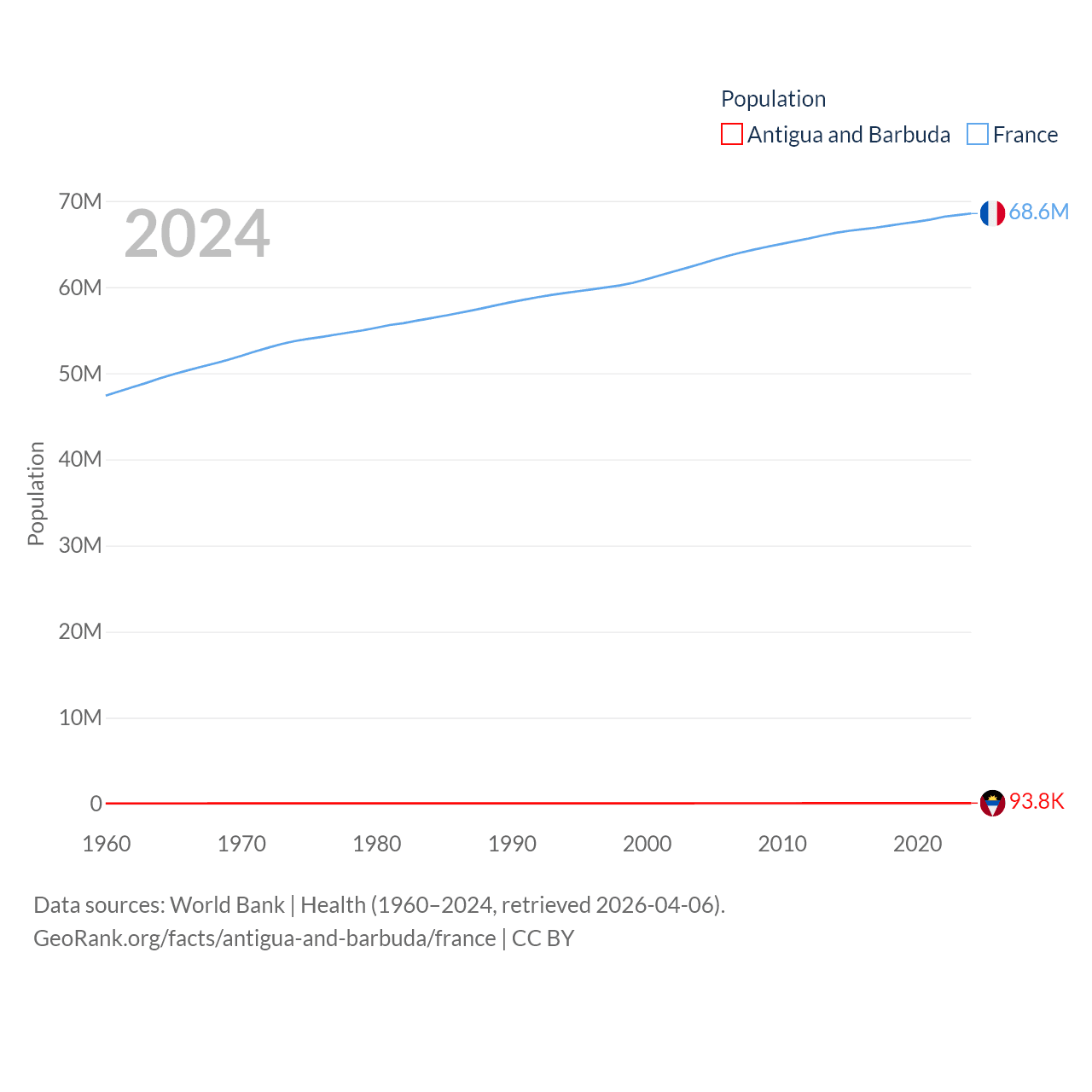 Antigua and Barbuda has a population of 93.8K (ranked 185/197), compared with 68.6M in France (ranked 23/197). Antigua and Barbuda's land area is 169.9 sq mi versus 208,090 sq mi for France (ranked 183rd vs. 48th).