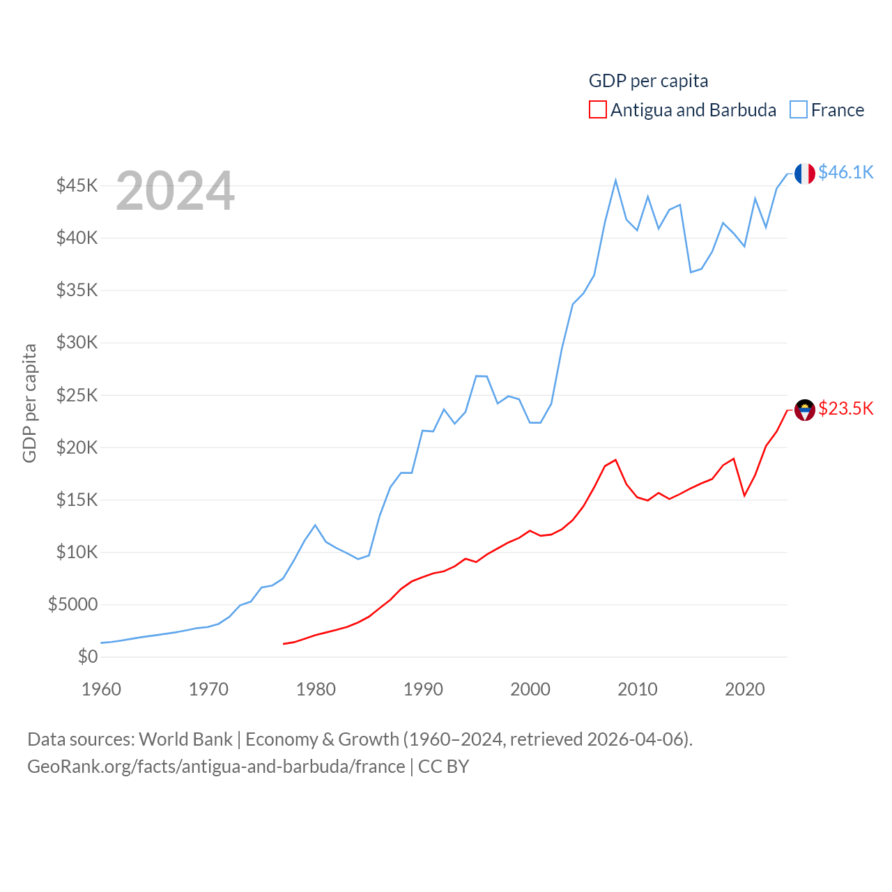 By GDP, Antigua and Barbuda ranks 177/197 ($2.21B) and France ranks 7/197 ($3.16T). By GDP per capita, Antigua and Barbuda ranks 53/197 ($23,542), while France ranks 27/197 ($46,103).