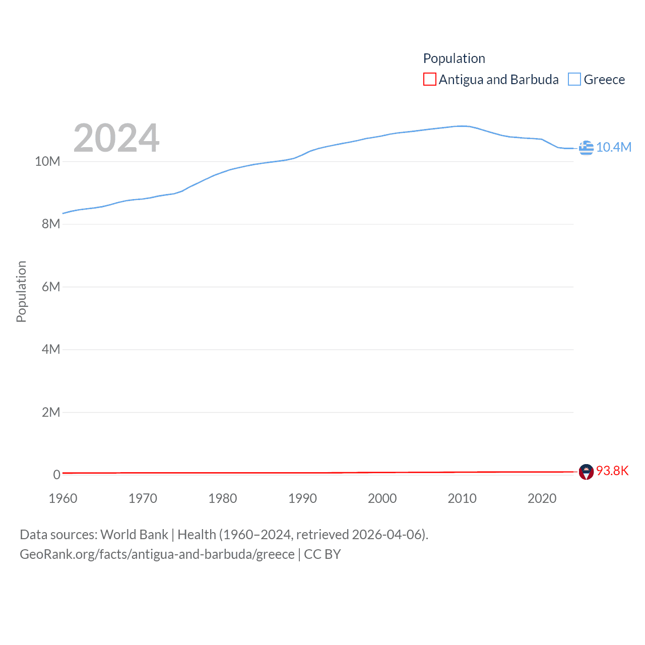 Antigua and Barbuda has a population of 93.8K (ranked 185/197), compared with 10.4M in Greece (ranked 94/197). Antigua and Barbuda's land area is 169.9 sq mi versus 49,769 sq mi for Greece (ranked 183rd vs. 95th).