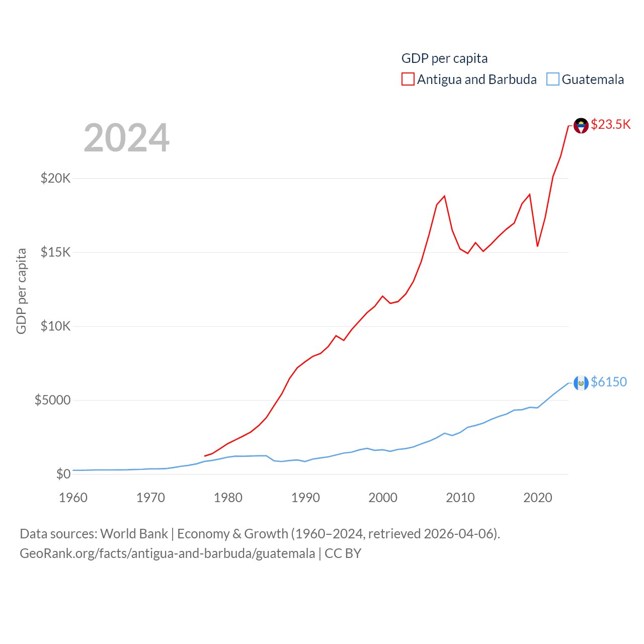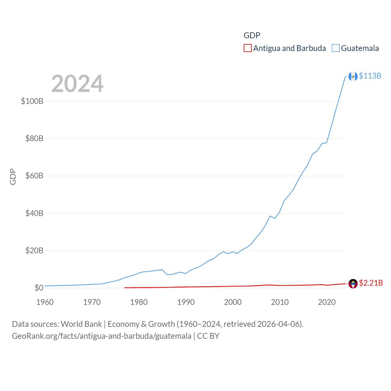 By GDP, Antigua and Barbuda ranks 177/197 ($2.21B) and Guatemala ranks 68/197 ($113B). By GDP per capita, Antigua and Barbuda ranks 53/197 ($23,542), while Guatemala ranks 112/197 ($6,150).