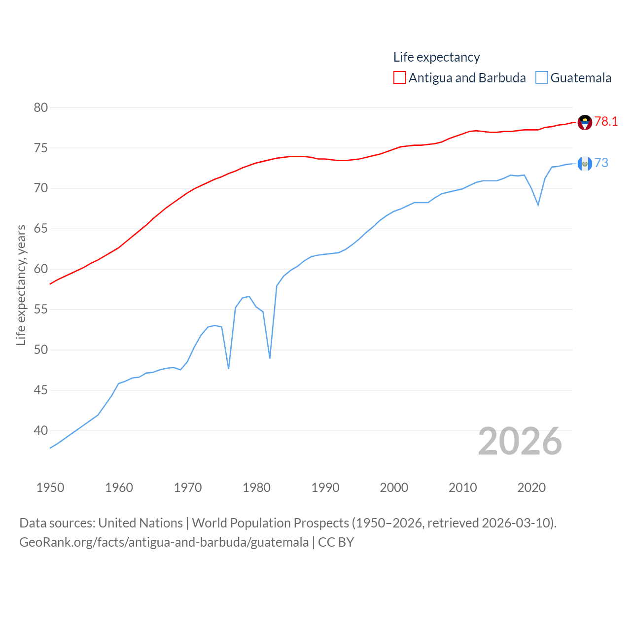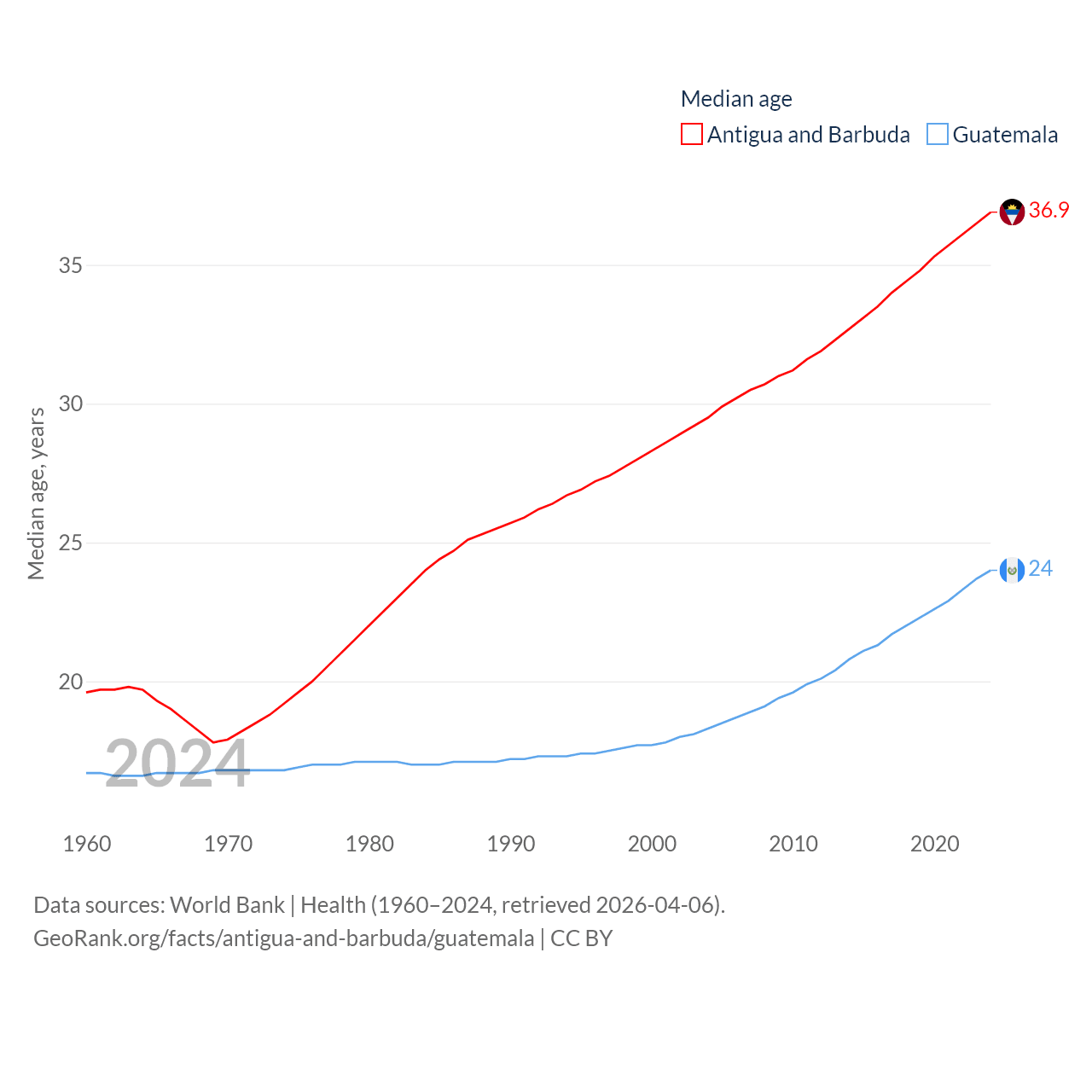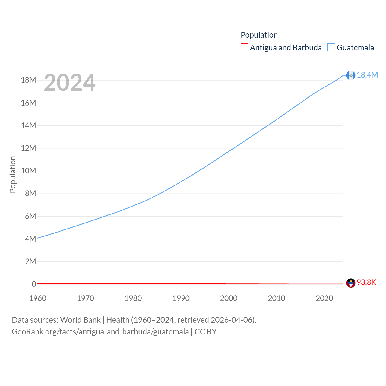 Antigua and Barbuda has a population of 93.8K (ranked 185/197), compared with 18.4M in Guatemala (ranked 70/197). Antigua and Barbuda's land area is 169.9 sq mi versus 41,375 sq mi for Guatemala (ranked 183rd vs. 102nd).