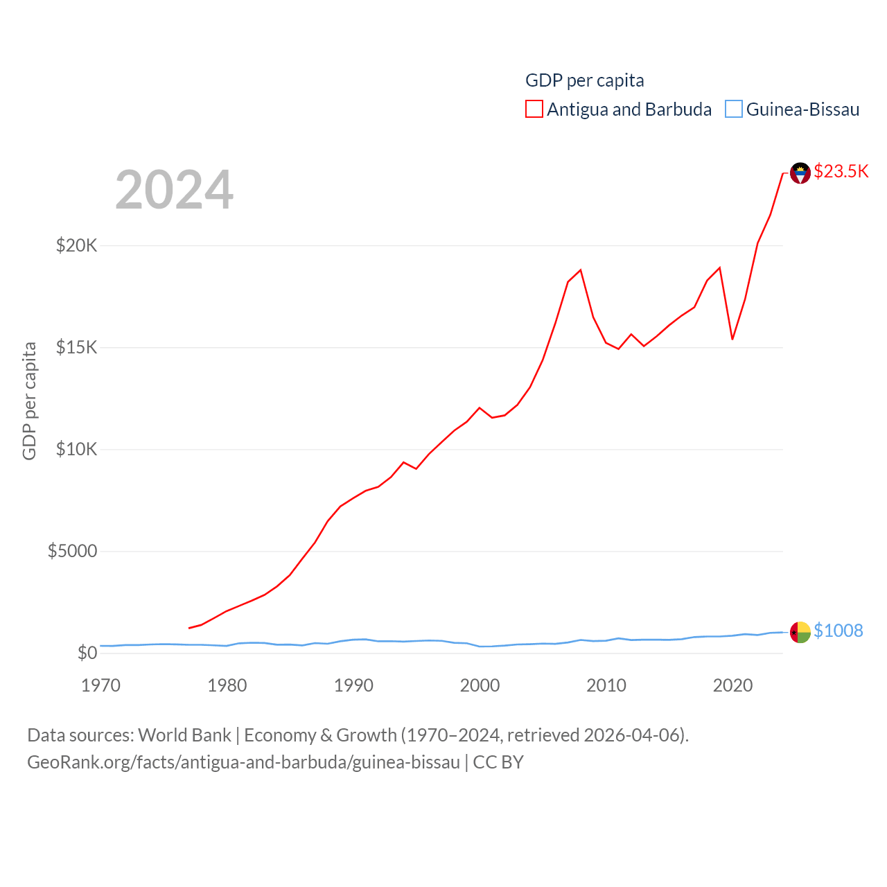 By GDP, Antigua and Barbuda ranks 177/197 ($2.21B) and Guinea-Bissau ranks 176/197 ($2.22B). By GDP per capita, Antigua and Barbuda ranks 53/197 ($23,542), while Guinea-Bissau ranks 177/197 ($1,008).