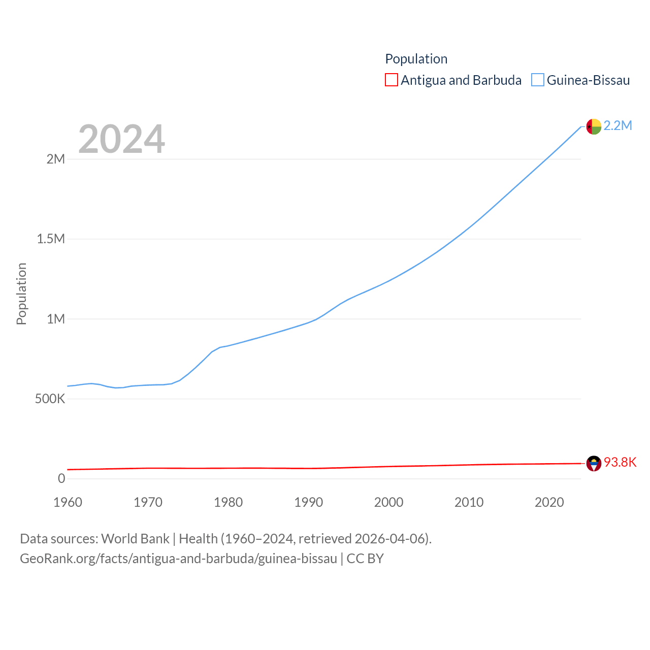 Antigua and Barbuda has a population of 93.8K (ranked 185/197), compared with 2.2M in Guinea-Bissau (ranked 146/197). Antigua and Barbuda's land area is 169.9 sq mi versus 10,857 sq mi for Guinea-Bissau (ranked 183rd vs. 139th).