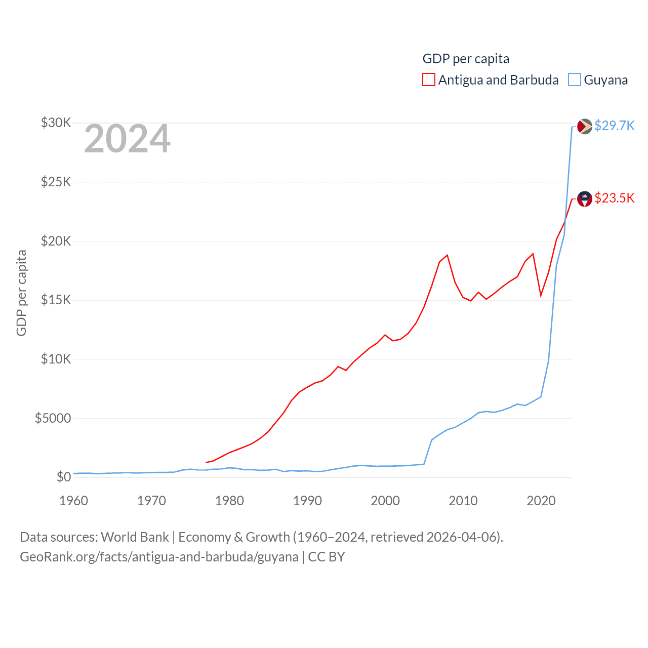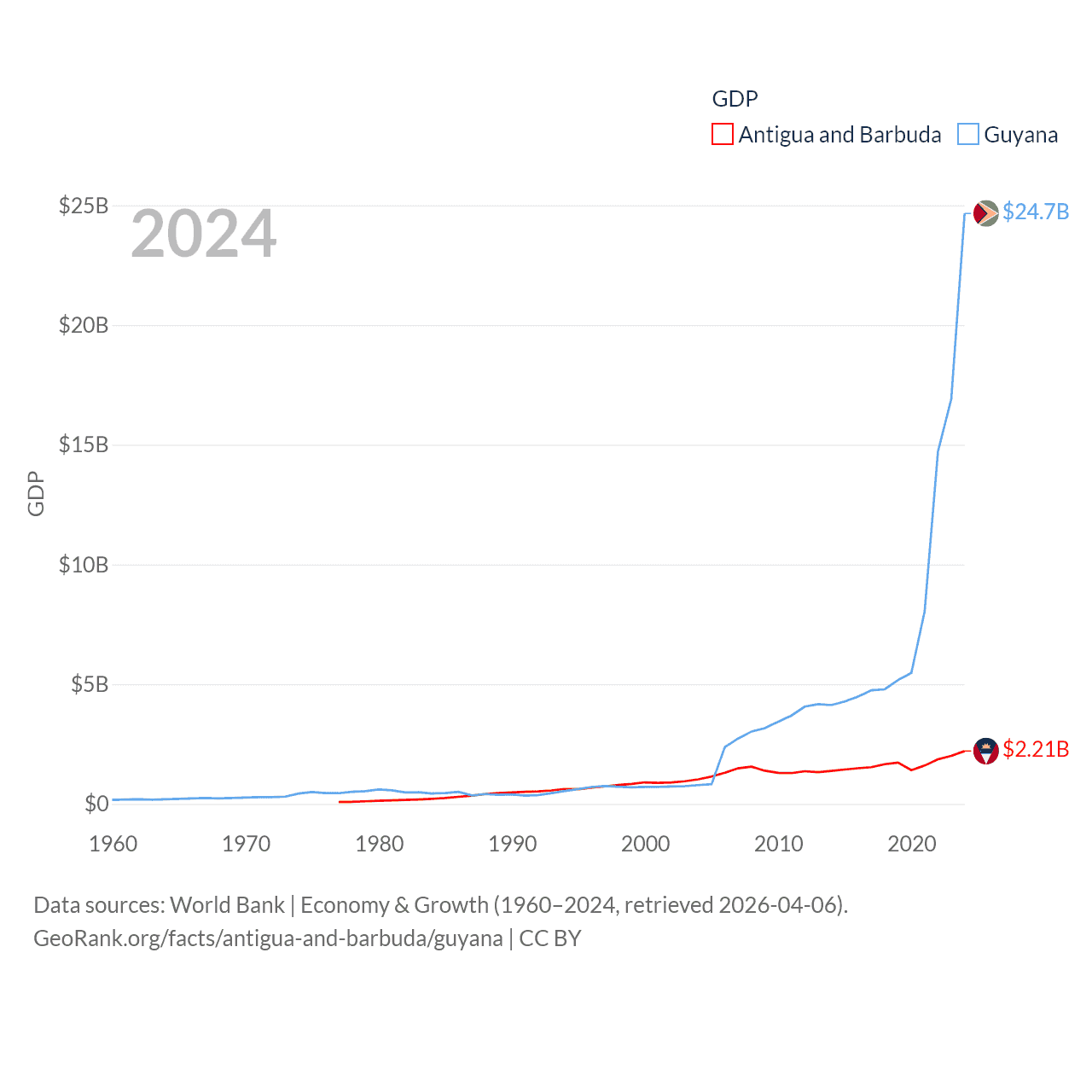 By GDP, Antigua and Barbuda ranks 177/197 ($2.21B) and Guyana ranks 120/197 ($24.7B). By GDP per capita, Antigua and Barbuda ranks 53/197 ($23,542), while Guyana ranks 41/197 ($29,675).