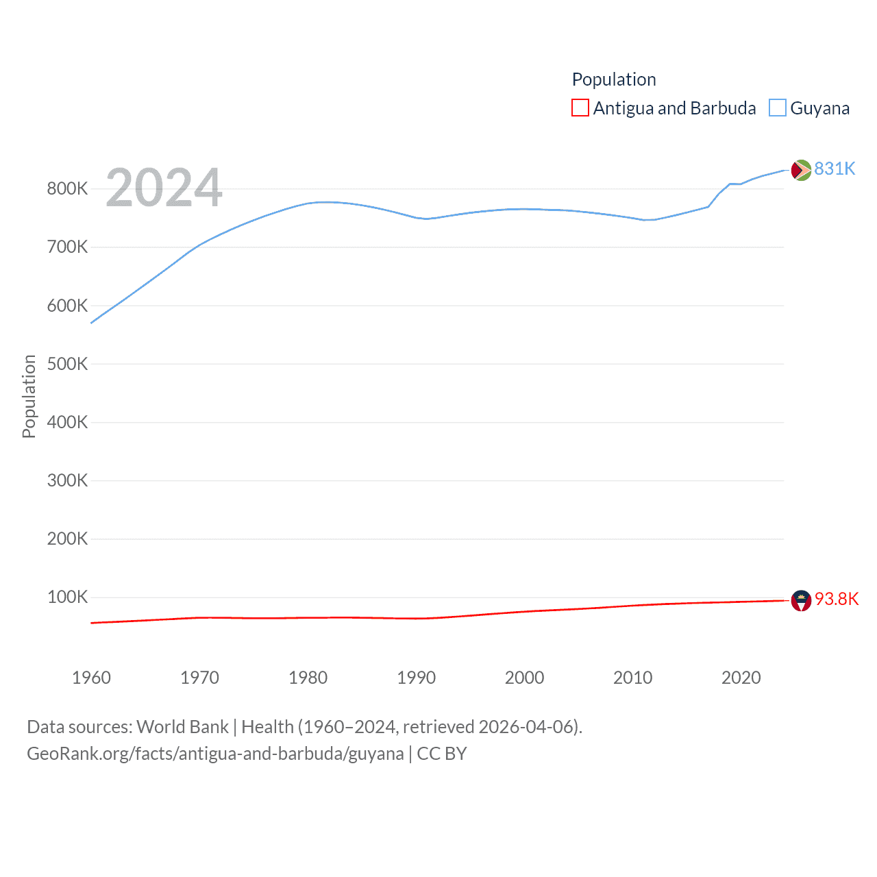 Antigua and Barbuda has a population of 93.8K (ranked 185/197), compared with 831K in Guyana (ranked 161/197). Antigua and Barbuda's land area is 169.9 sq mi versus 81,522 sq mi for Guyana (ranked 183rd vs. 82nd).