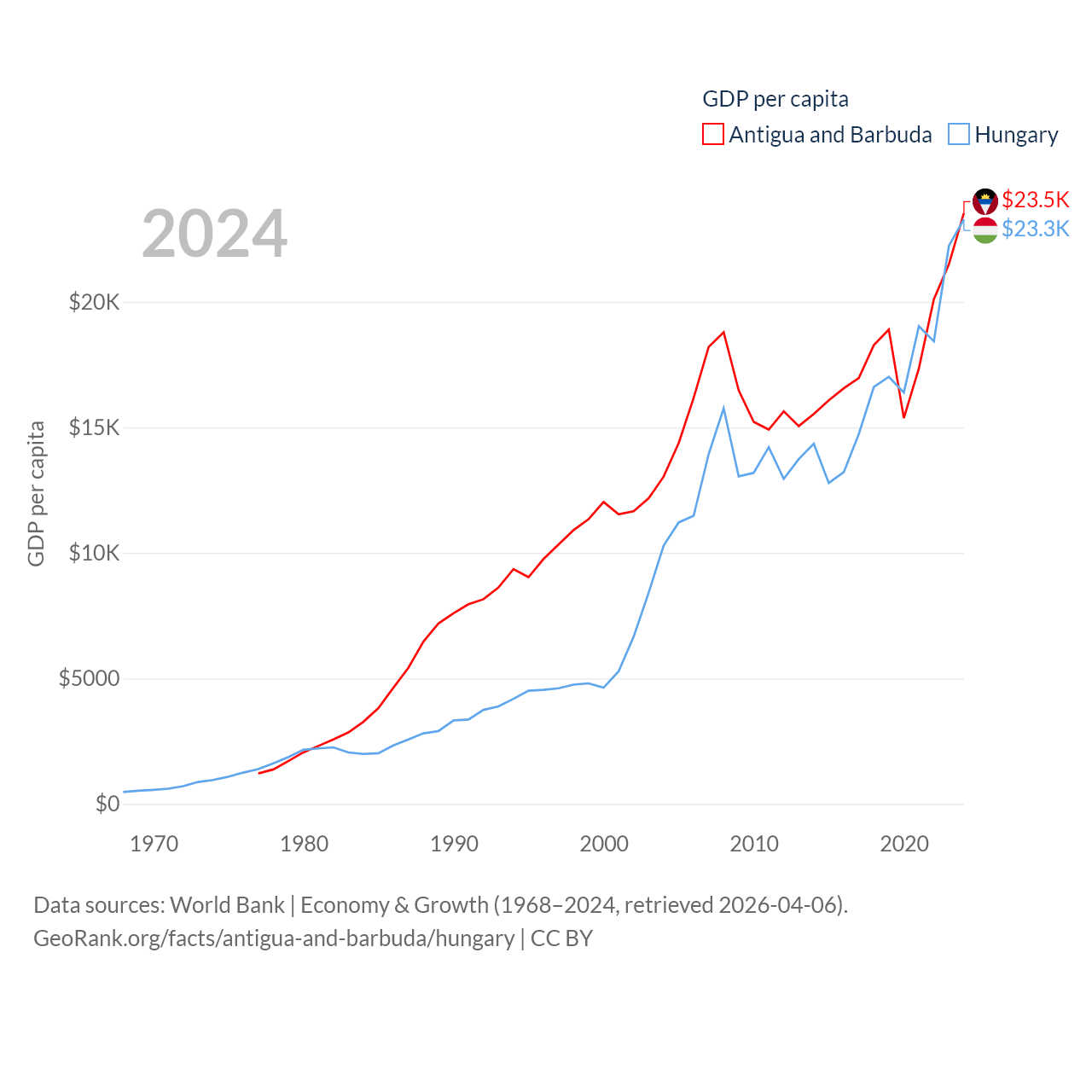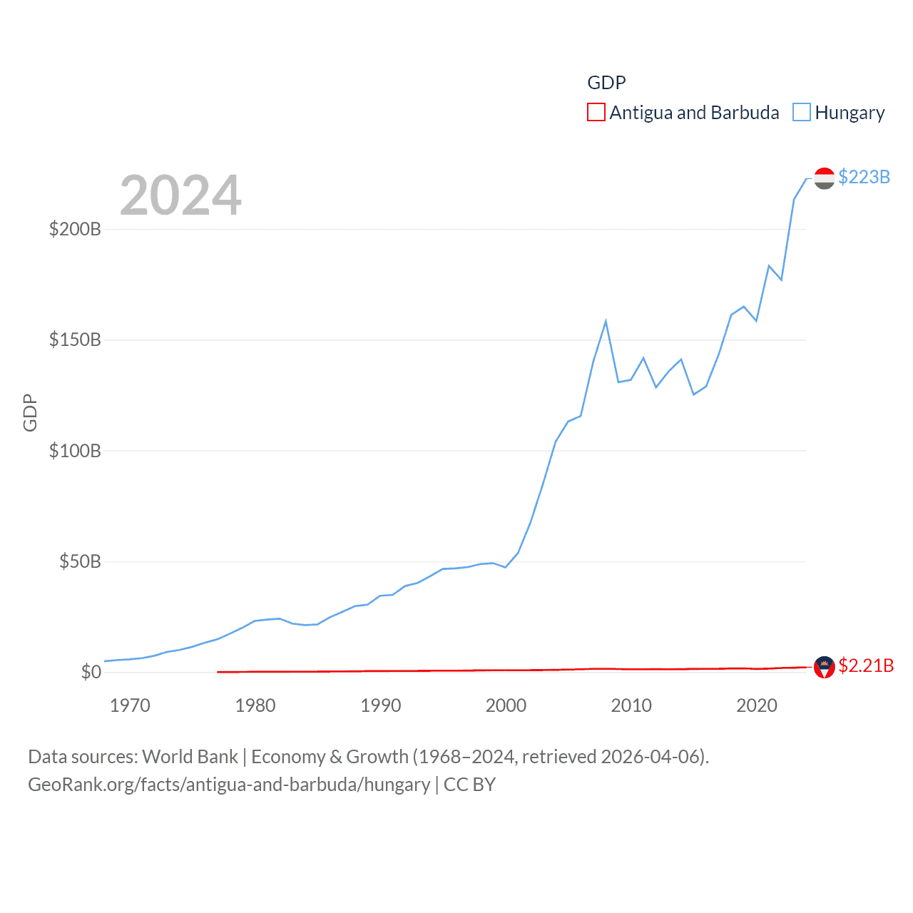 By GDP, Antigua and Barbuda ranks 177/197 ($2.21B) and Hungary ranks 55/197 ($223B). By GDP per capita, Antigua and Barbuda ranks 53/197 ($23,542), while Hungary ranks 55/197 ($23,292).