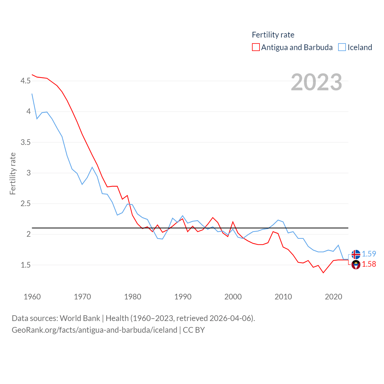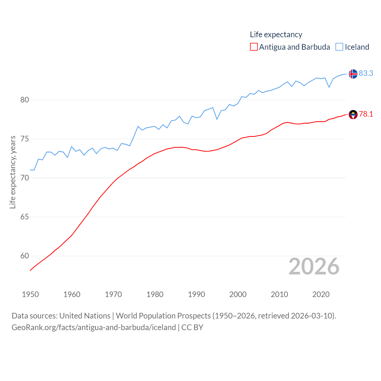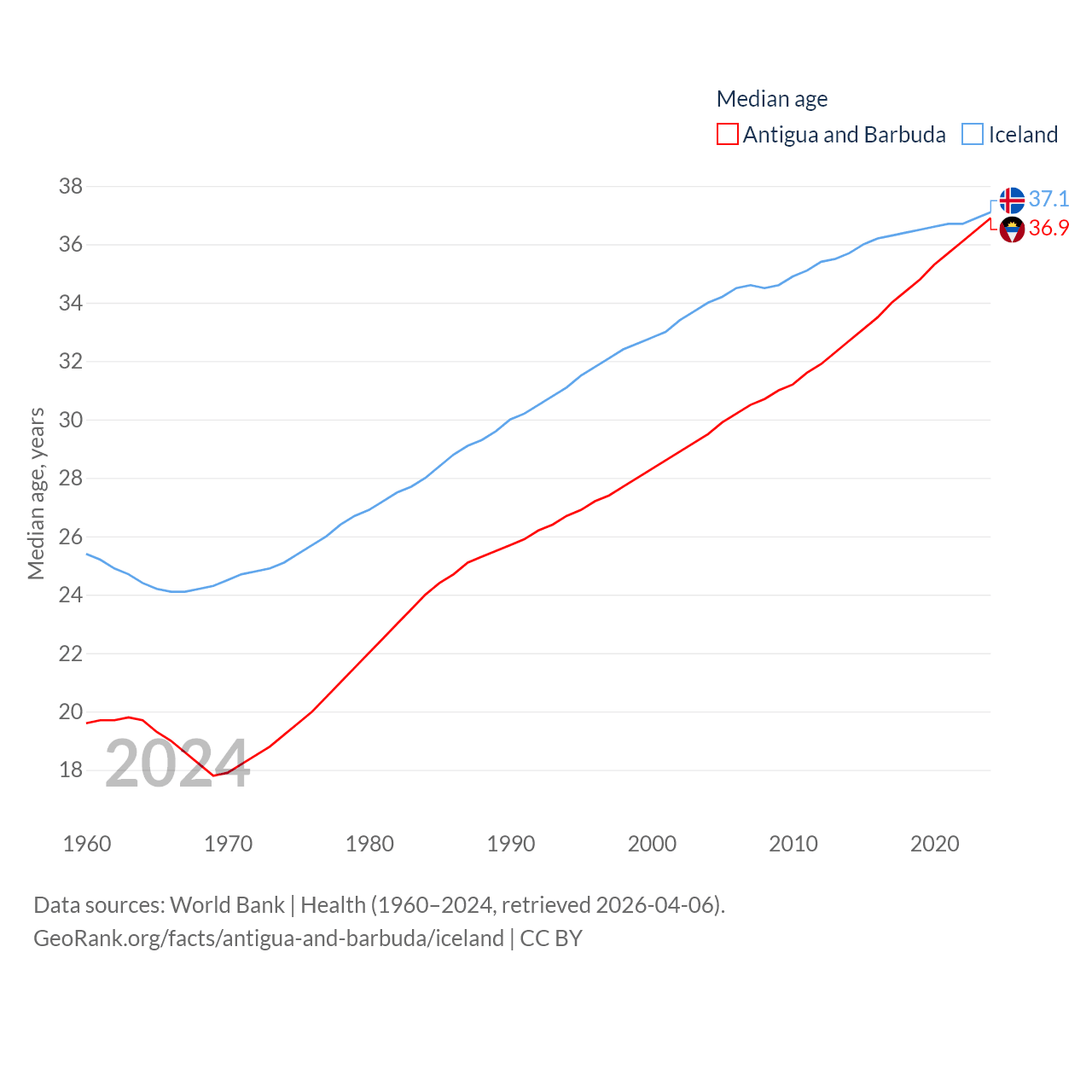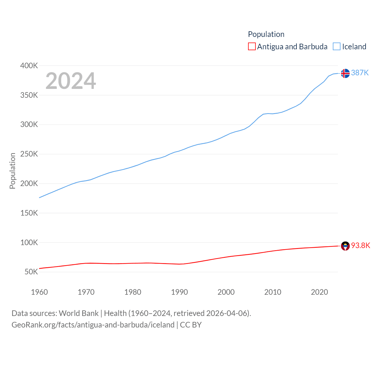 Antigua and Barbuda has a population of 93.8K (ranked 185/197), compared with 387K in Iceland (ranked 173/197). Antigua and Barbuda's land area is 169.9 sq mi versus 38,931 sq mi for Iceland (ranked 183rd vs. 104th).