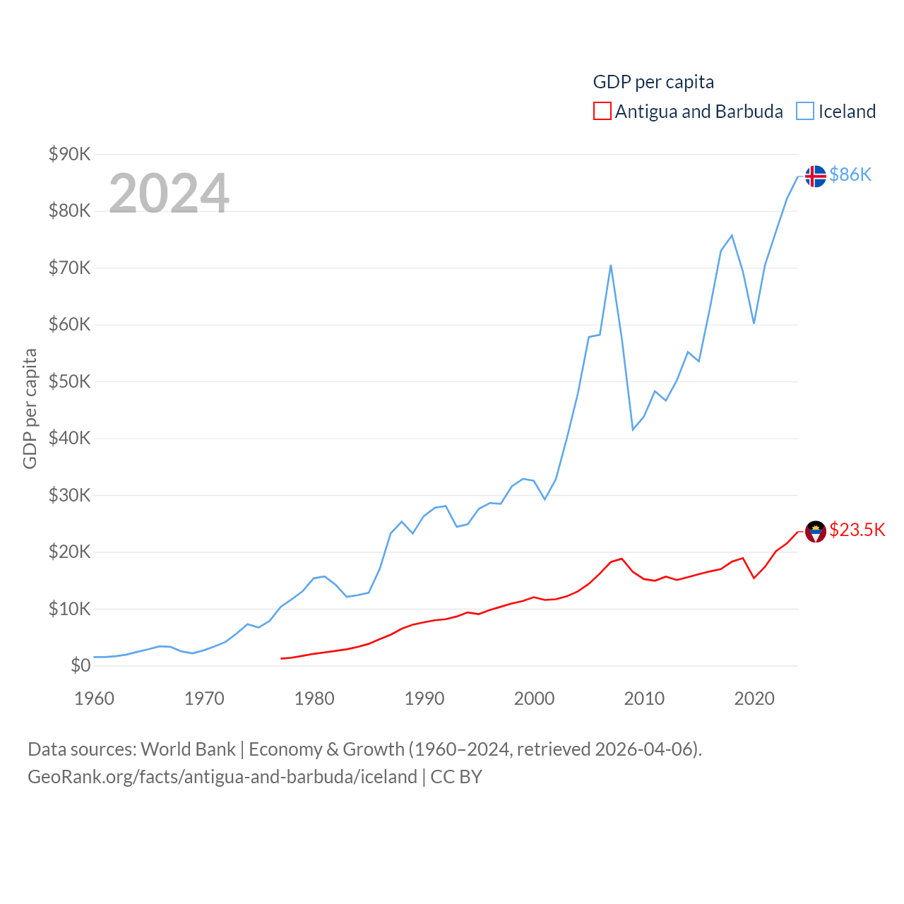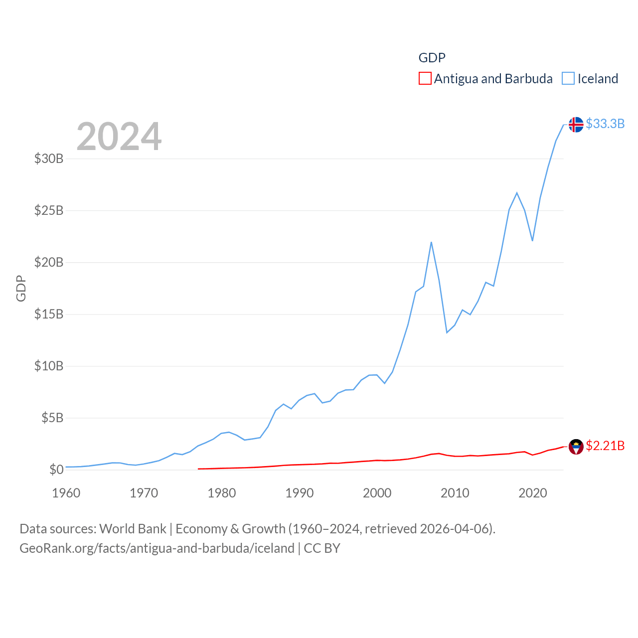By GDP, Antigua and Barbuda ranks 177/197 ($2.21B) and Iceland ranks 108/197 ($33.3B). By GDP per capita, Antigua and Barbuda ranks 53/197 ($23,542), while Iceland ranks 9/197 ($86,041).