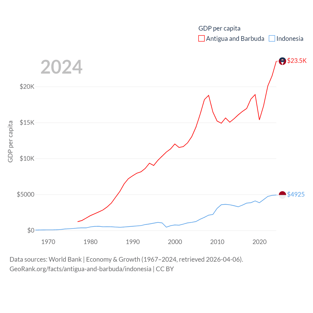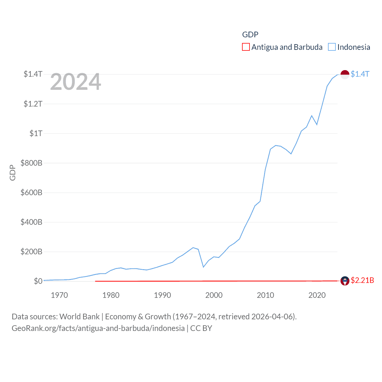 By GDP, Antigua and Barbuda ranks 177/197 ($2.21B) and Indonesia ranks 16/197 ($1.4T). By GDP per capita, Antigua and Barbuda ranks 53/197 ($23,542), while Indonesia ranks 121/197 ($4,925).