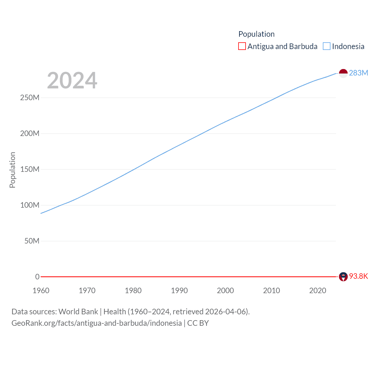 Antigua and Barbuda has a population of 93.8K (ranked 185/197), compared with 283M in Indonesia (ranked 4/197). Antigua and Barbuda's land area is 169.9 sq mi versus 730,720 sq mi for Indonesia (ranked 183rd vs. 14th).