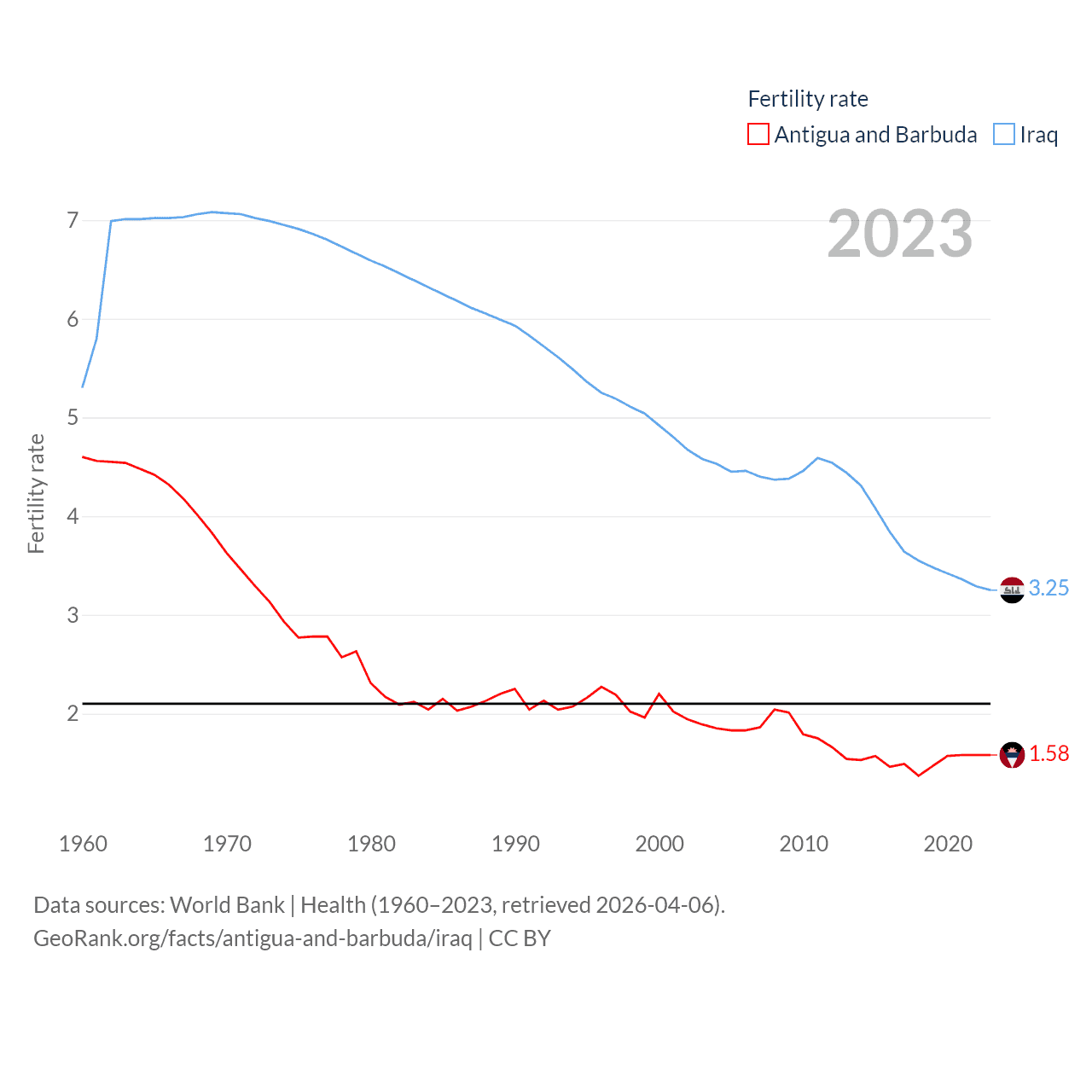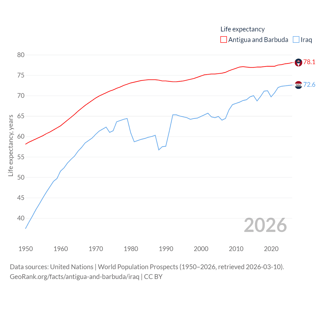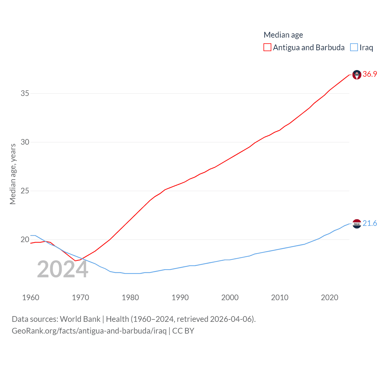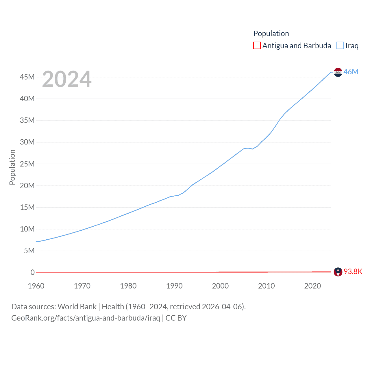 Antigua and Barbuda has a population of 93.8K (ranked 185/197), compared with 46M in Iraq (ranked 34/197). Antigua and Barbuda's land area is 169.9 sq mi versus 167,619 sq mi for Iraq (ranked 183rd vs. 57th).