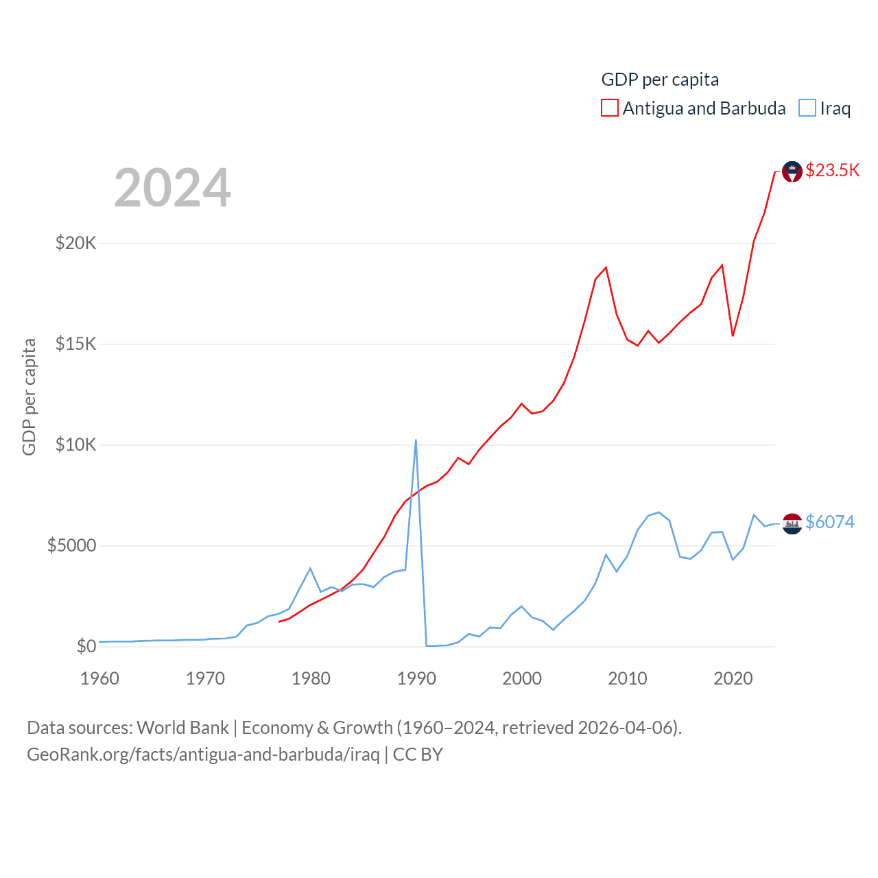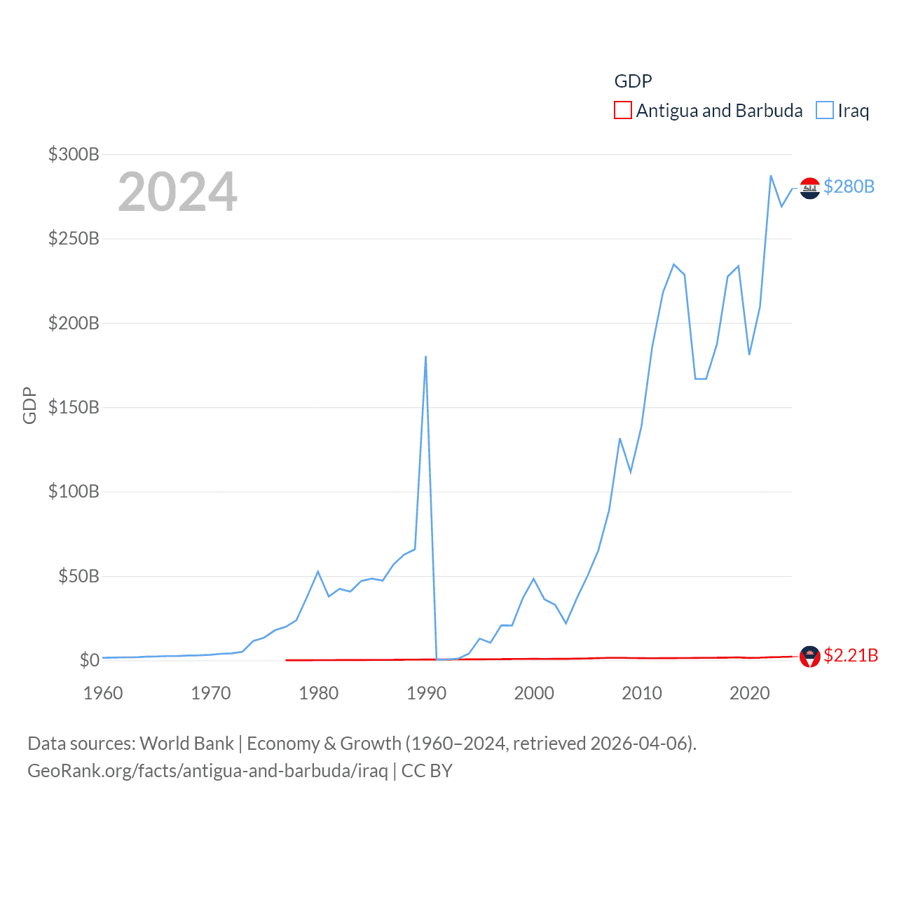 By GDP, Antigua and Barbuda ranks 177/197 ($2.21B) and Iraq ranks 50/197 ($280B). By GDP per capita, Antigua and Barbuda ranks 53/197 ($23,542), while Iraq ranks 113/197 ($6,074).