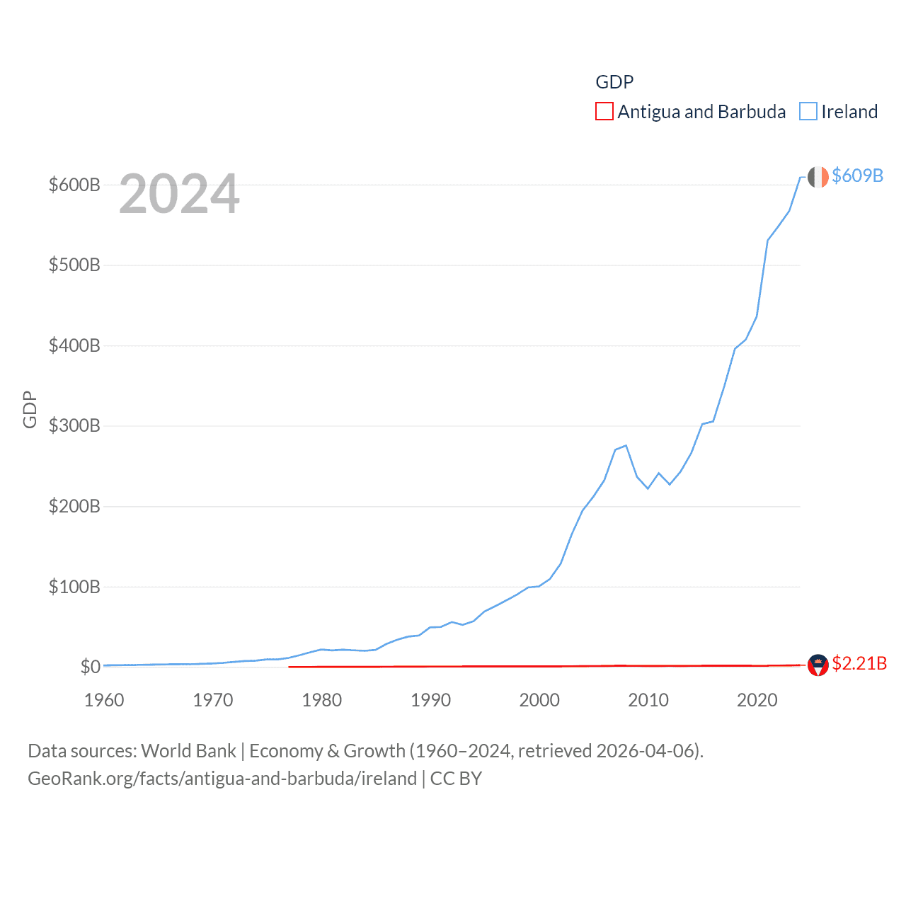 By GDP, Antigua and Barbuda ranks 177/197 ($2.21B) and Ireland ranks 25/197 ($609B). By GDP per capita, Antigua and Barbuda ranks 53/197 ($23,542), while Ireland ranks 4/197 ($112,895).