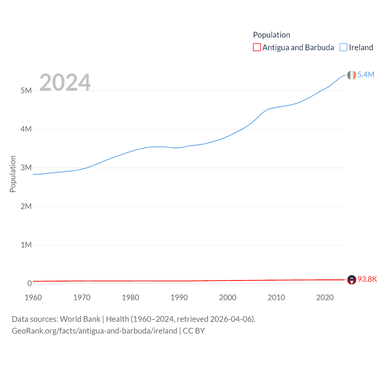 Antigua and Barbuda has a population of 93.8K (ranked 185/197), compared with 5.4M in Ireland (ranked 120/197). Antigua and Barbuda's land area is 169.9 sq mi versus 26,599 sq mi for Ireland (ranked 183rd vs. 119th).