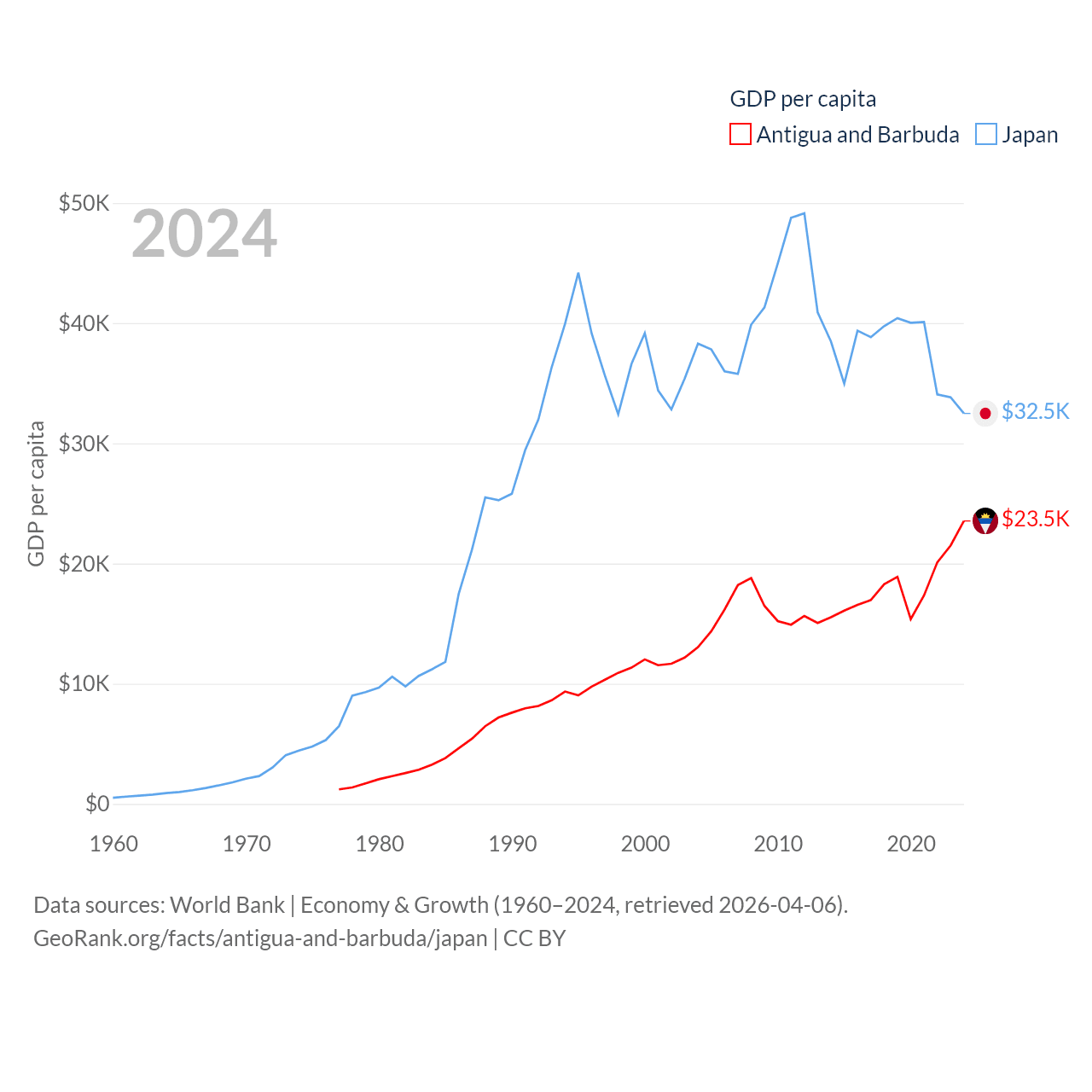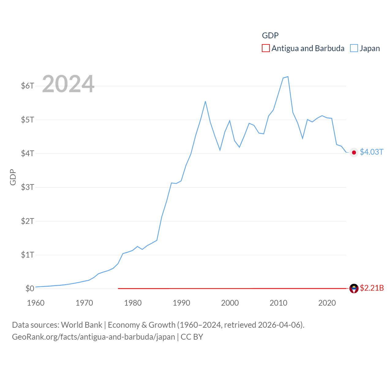 By GDP, Antigua and Barbuda ranks 177/197 ($2.21B) and Japan ranks 4/197 ($4.03T). By GDP per capita, Antigua and Barbuda ranks 53/197 ($23,542), while Japan ranks 38/197 ($32,487).