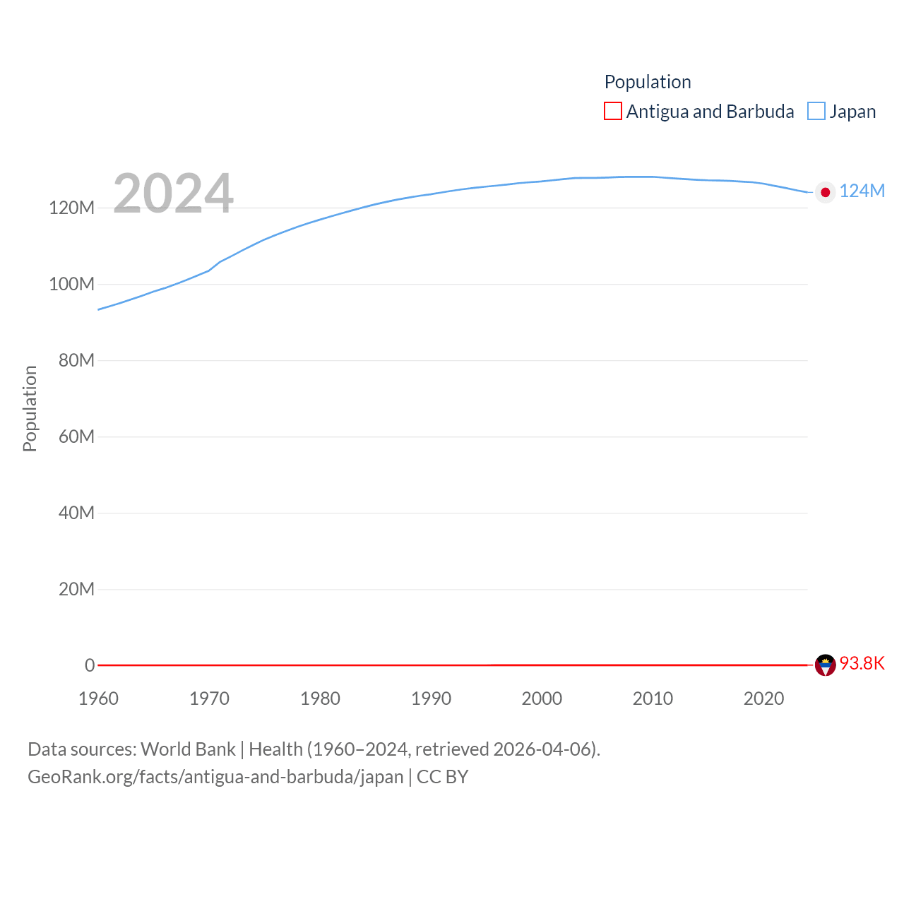 Antigua and Barbuda has a population of 93.8K (ranked 185/197), compared with 124M in Japan (ranked 12/197). Antigua and Barbuda's land area is 169.9 sq mi versus 140,761 sq mi for Japan (ranked 183rd vs. 61st).