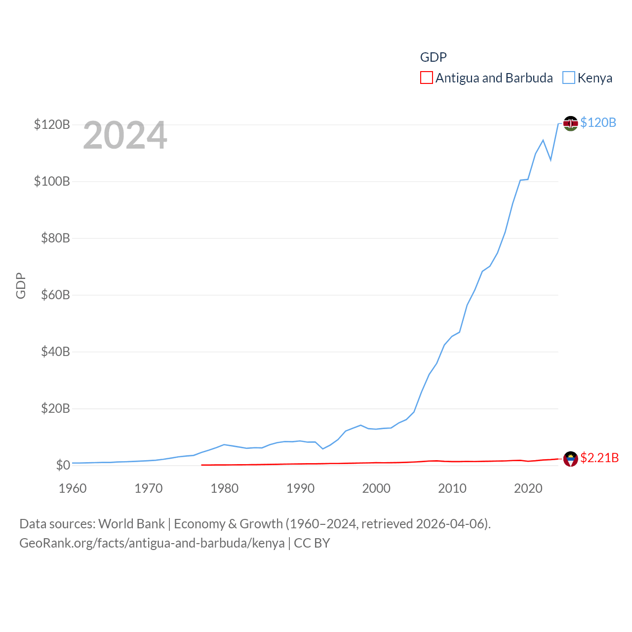 By GDP, Antigua and Barbuda ranks 177/197 ($2.21B) and Kenya ranks 64/197 ($120B). By GDP per capita, Antigua and Barbuda ranks 53/197 ($23,542), while Kenya ranks 154/197 ($2,132).