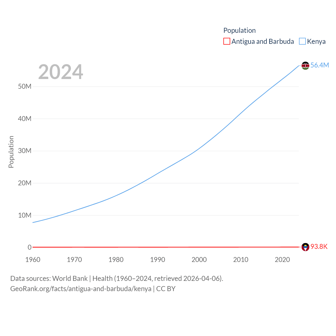 Antigua and Barbuda has a population of 93.8K (ranked 185/197), compared with 56.4M in Kenya (ranked 26/197). Antigua and Barbuda's land area is 169.9 sq mi versus 224,278 sq mi for Kenya (ranked 183rd vs. 45th).