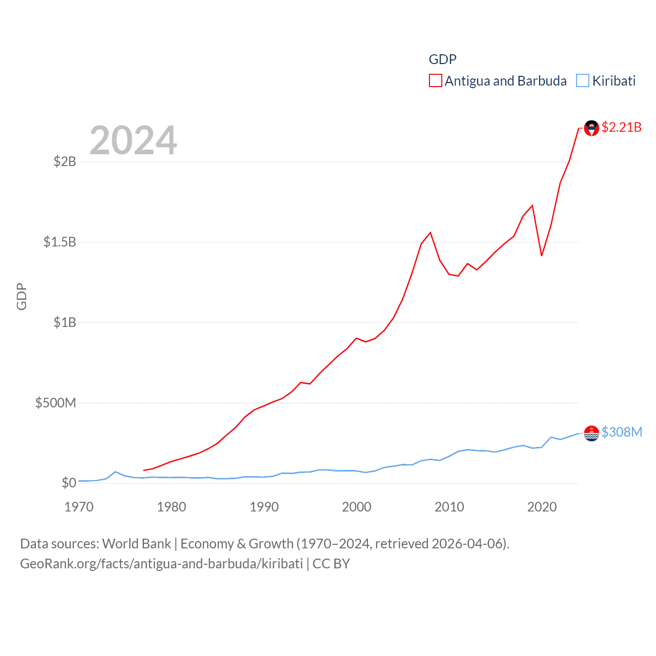 By GDP, Antigua and Barbuda ranks 177/197 ($2.21B) and Kiribati ranks 192/197 ($308M). By GDP per capita, Antigua and Barbuda ranks 53/197 ($23,542), while Kiribati ranks 152/197 ($2,289).