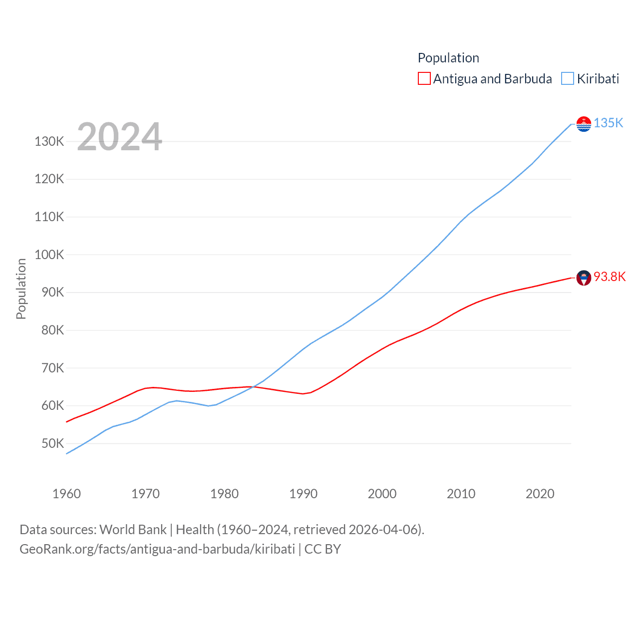 Antigua and Barbuda has a population of 93.8K (ranked 185/197), compared with 135K in Kiribati (ranked 180/197). Antigua and Barbuda's land area is 169.9 sq mi versus 313 sq mi for Kiribati (ranked 183rd vs. 173rd).