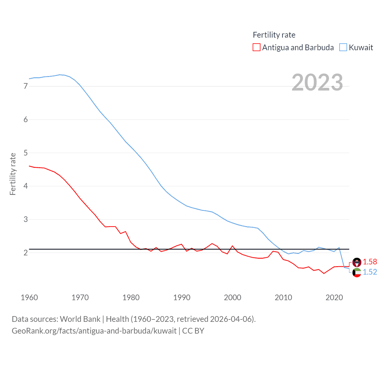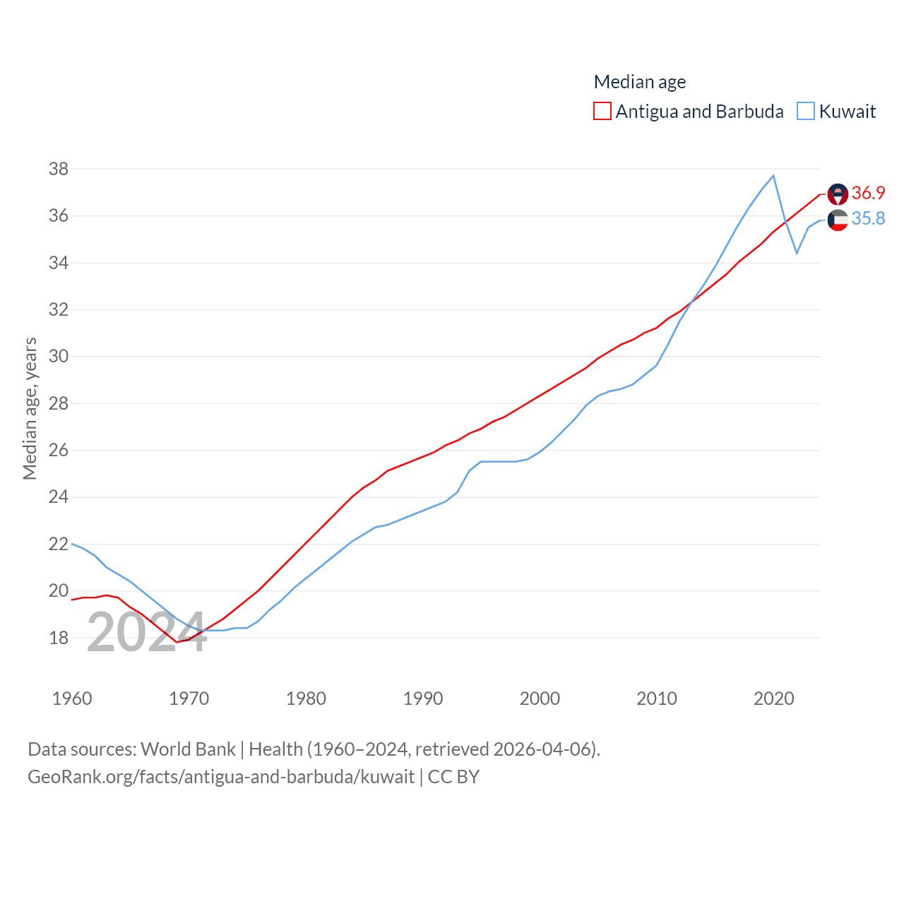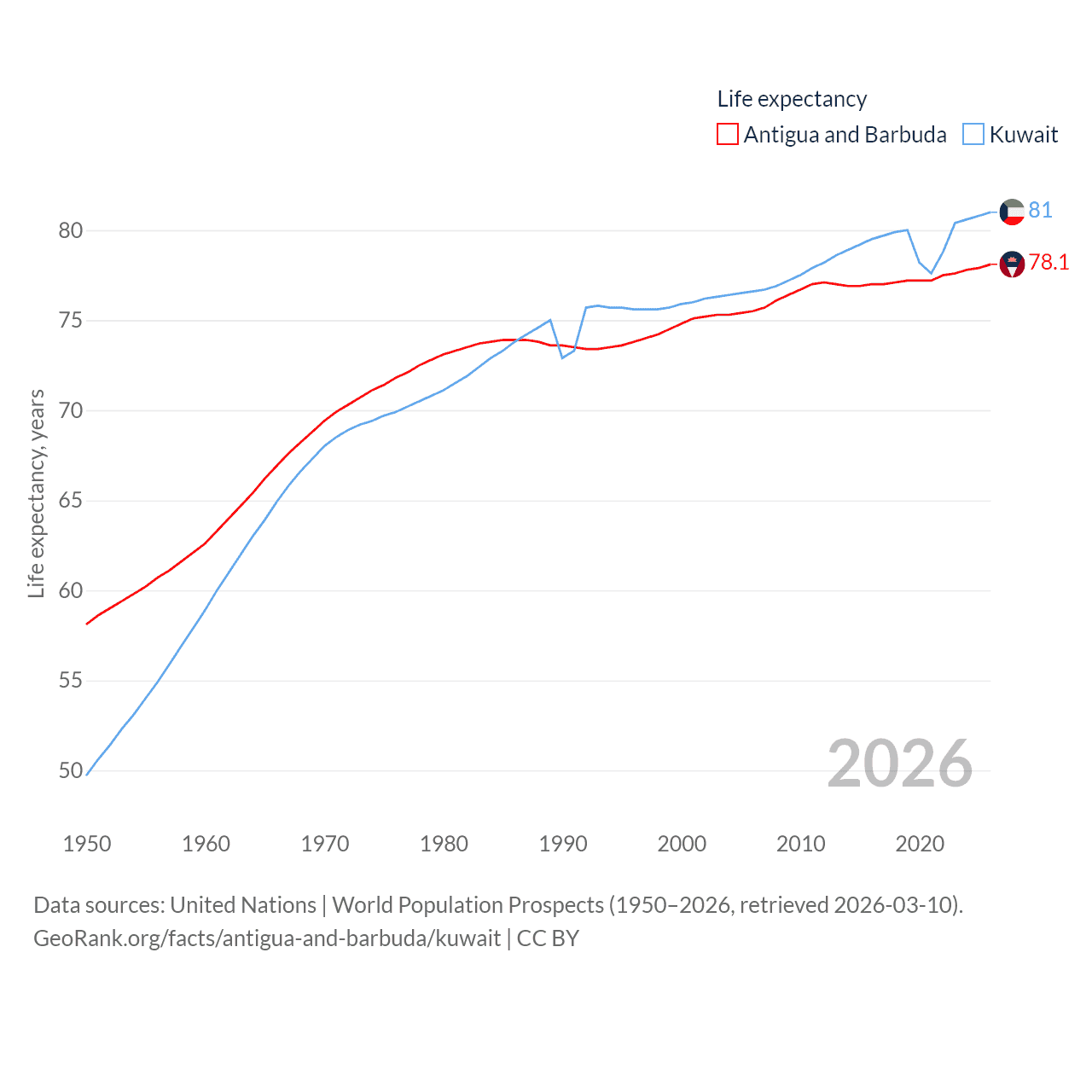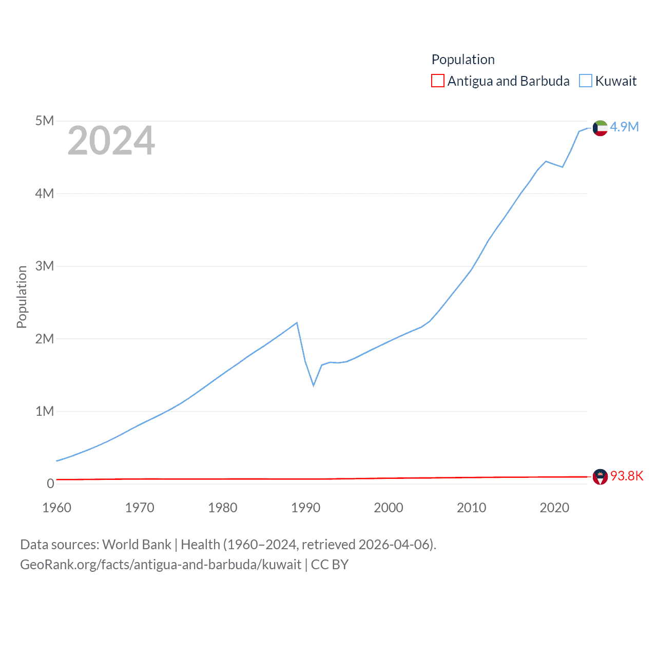 Antigua and Barbuda has a population of 93.8K (ranked 185/197), compared with 4.9M in Kuwait (ranked 127/197). Antigua and Barbuda's land area is 169.9 sq mi versus 6,880 sq mi for Kuwait (ranked 183rd vs. 153rd).
